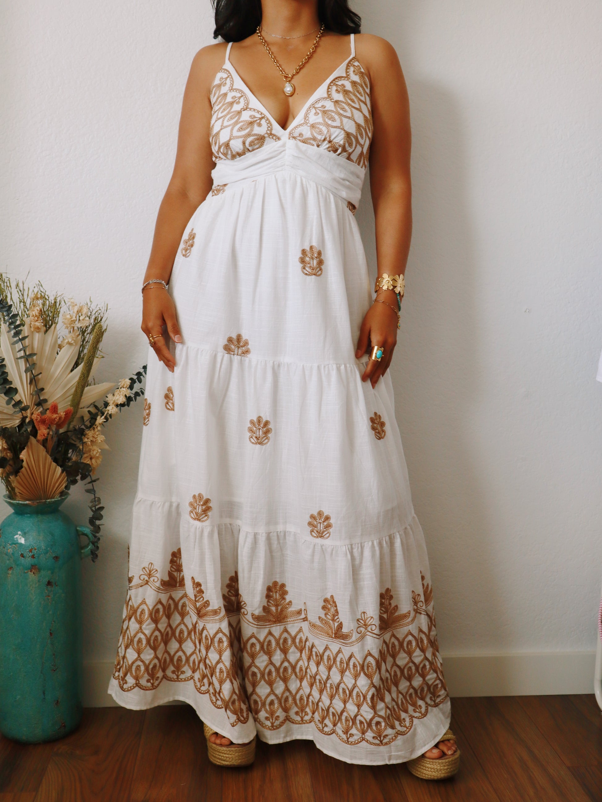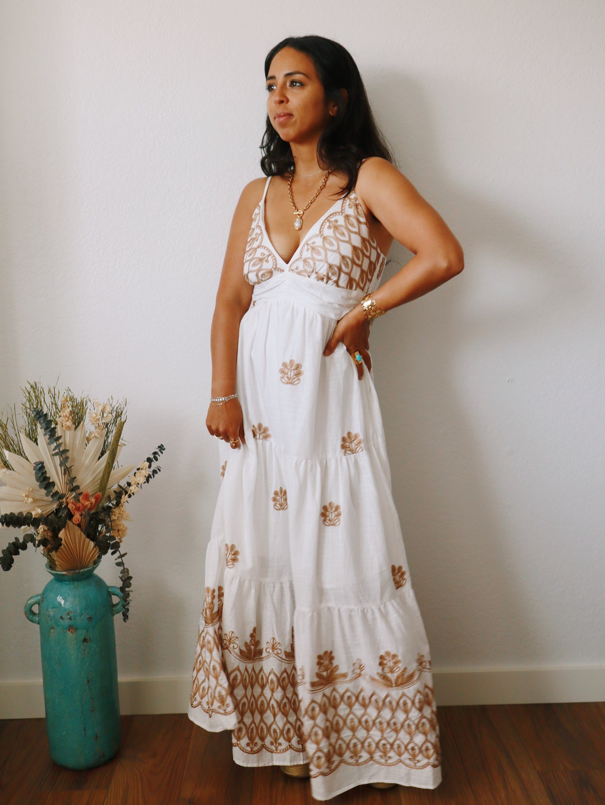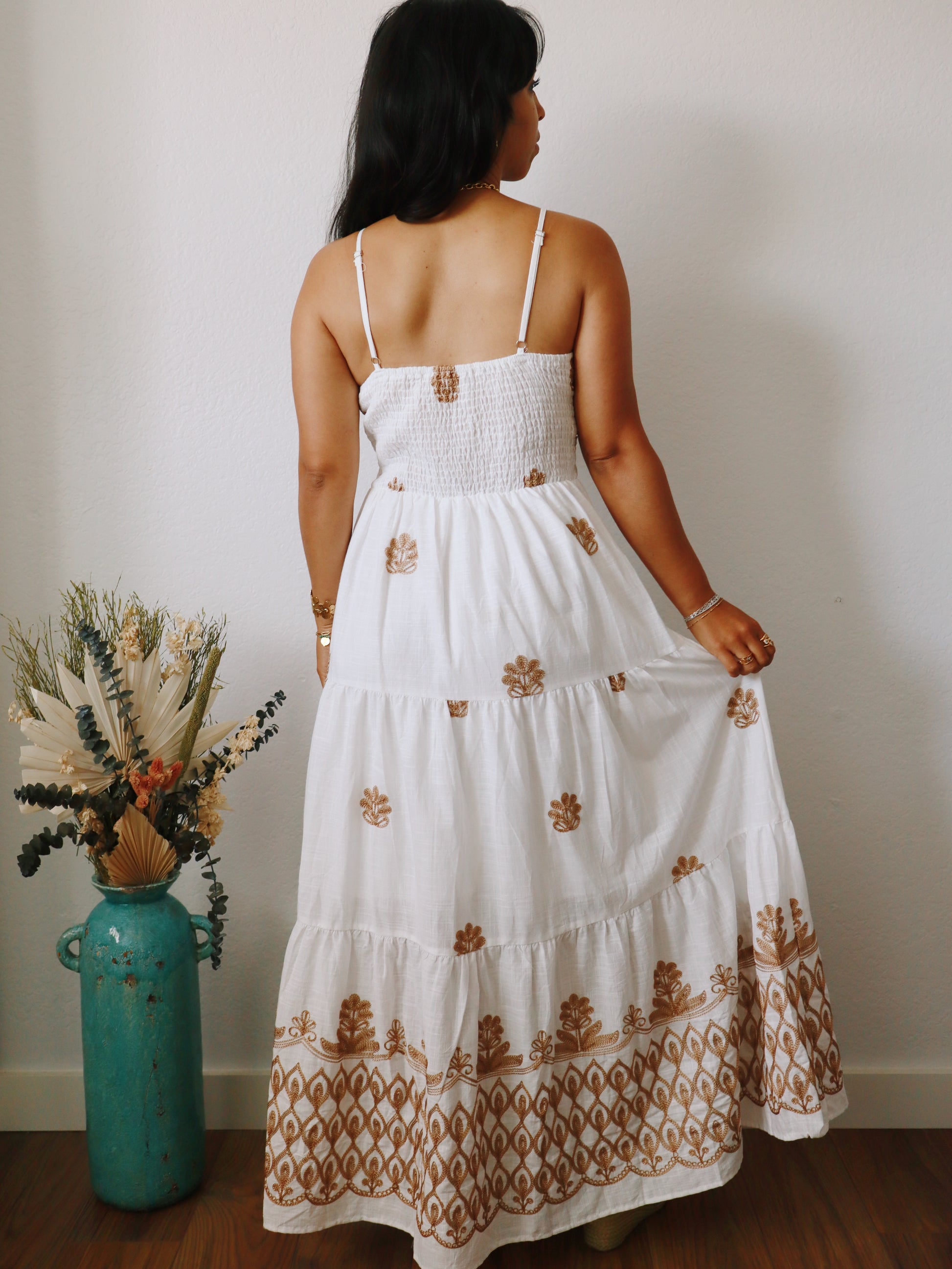 Experience effortless elegance with the Antonia Embroidered Dress. Crafted from soft cotton, it features delicate adjustable shoulder straps and a smocked back for a comfortable, adjustable fit. The dress is fully lined and adorned with intricate embroidery, adding a touch of artisanal charm. Its flowy silhouette ensures you stay cool and graceful all day long, making it perfect for any occasion where style meets comfort.