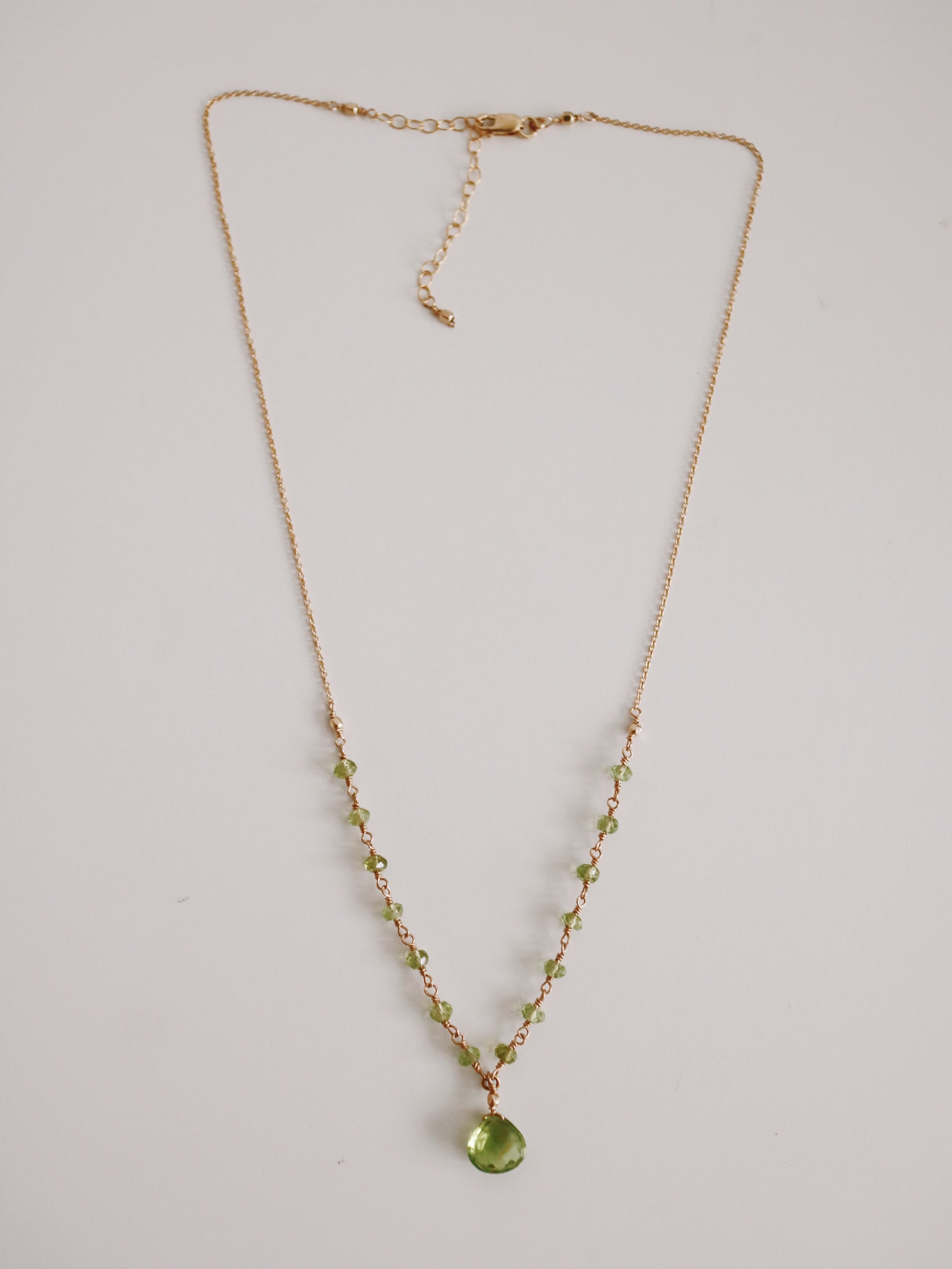 Elevate your elegance with the Beatrice Necklace, featuring 14k gold-filled wire-wrapped peridot gemstones. Its delicate, feminine design makes it an exquisite choice for layering, adding a subtle sophistication to any outfit. This necklace is also waterproof, ensuring lasting beauty and durability for everyday wear.