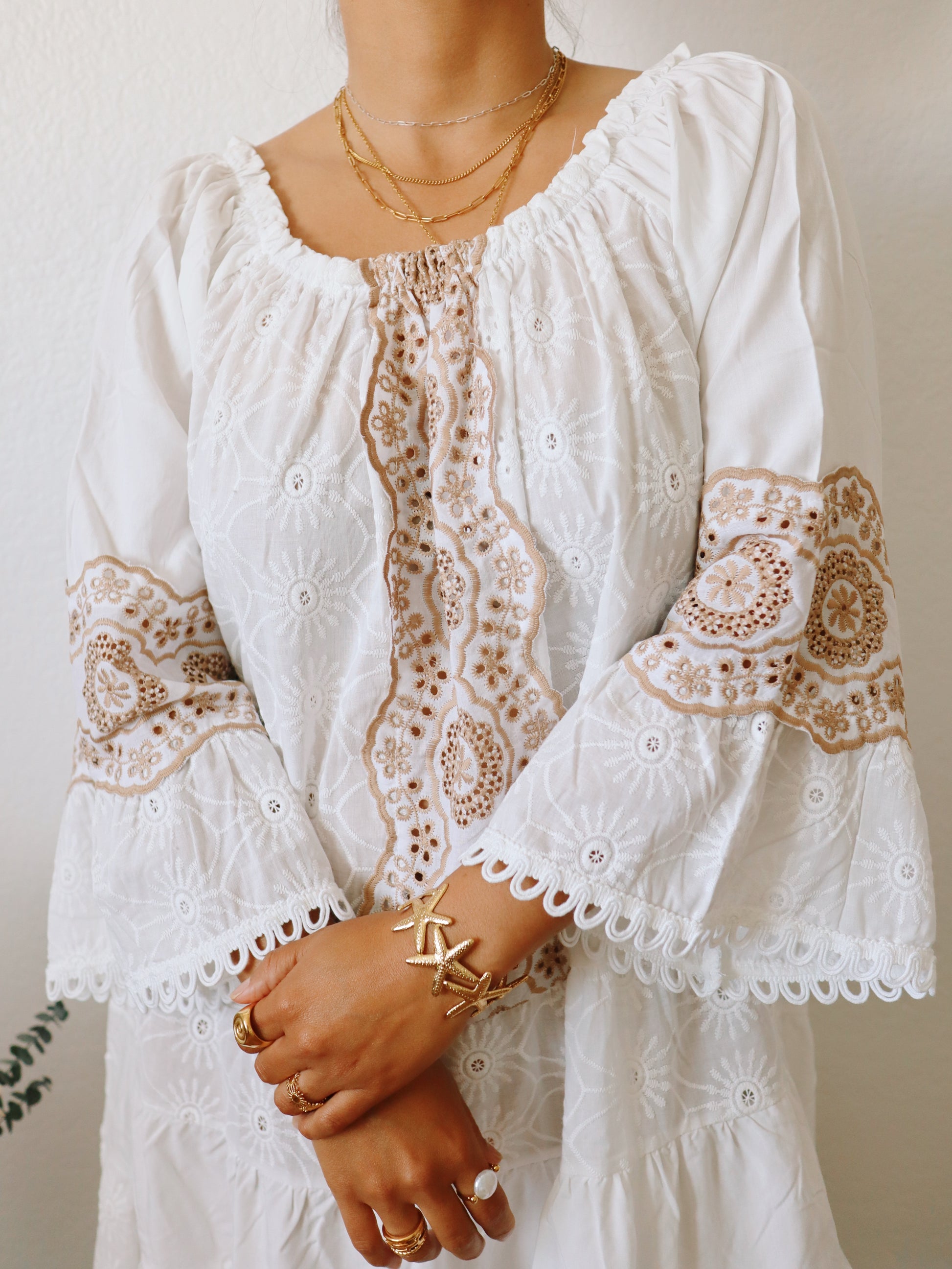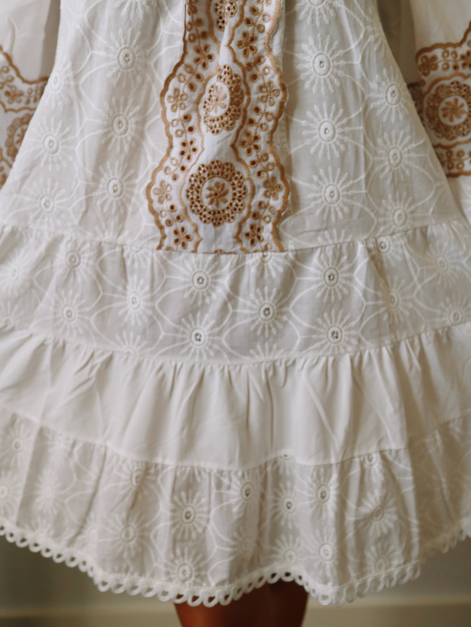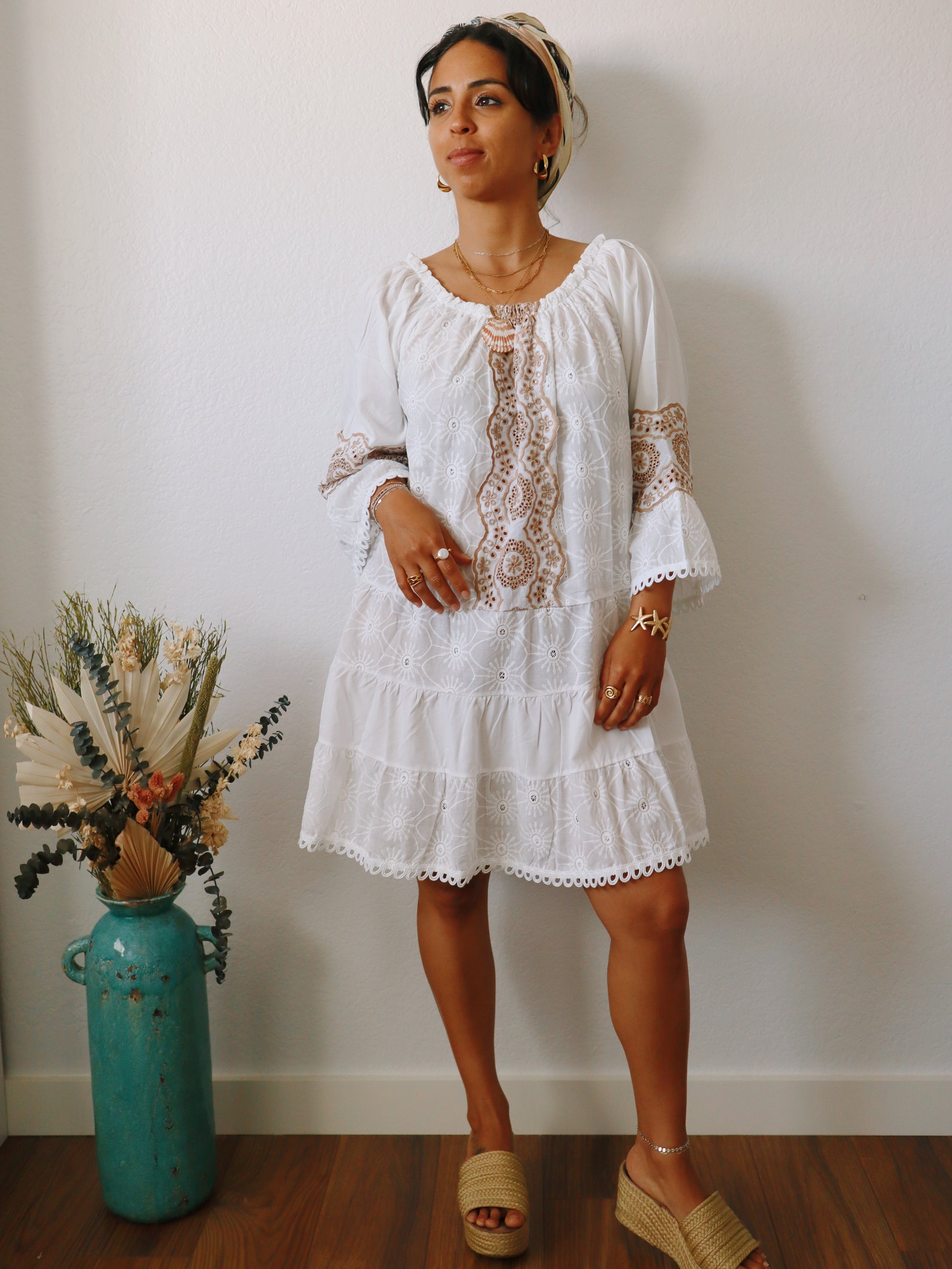 The Emilia Dress is a charming babydoll style featuring bell sleeves and ruffle tiered layers for a playful, feminine look. Detailed with delicate embroidery and lace, it offers an elastic collar that allows for versatile off-the-shoulder styling. Perfect as a beach cover-up or for warm summer days, this short dress combines comfort and effortless style to keep you cool and radiant wherever you go.
