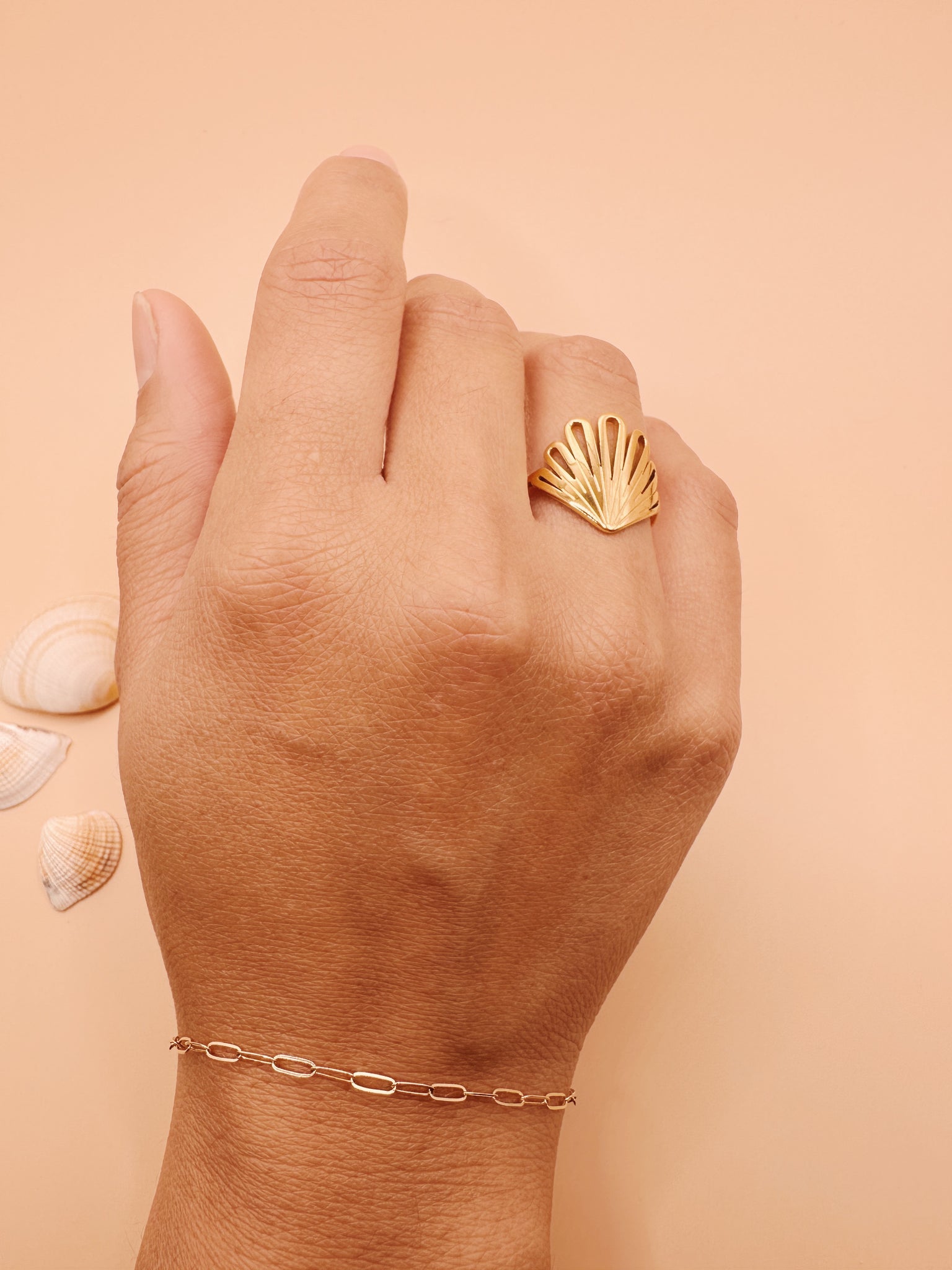 This gorgeous statement ring features a cute shell detail, inspired by the ocean. Made with 18k PVD gold plating, it is non-tarnishing, waterproof, and hypoallergenic, making it a perfect everyday accessory for a minimalist style.
