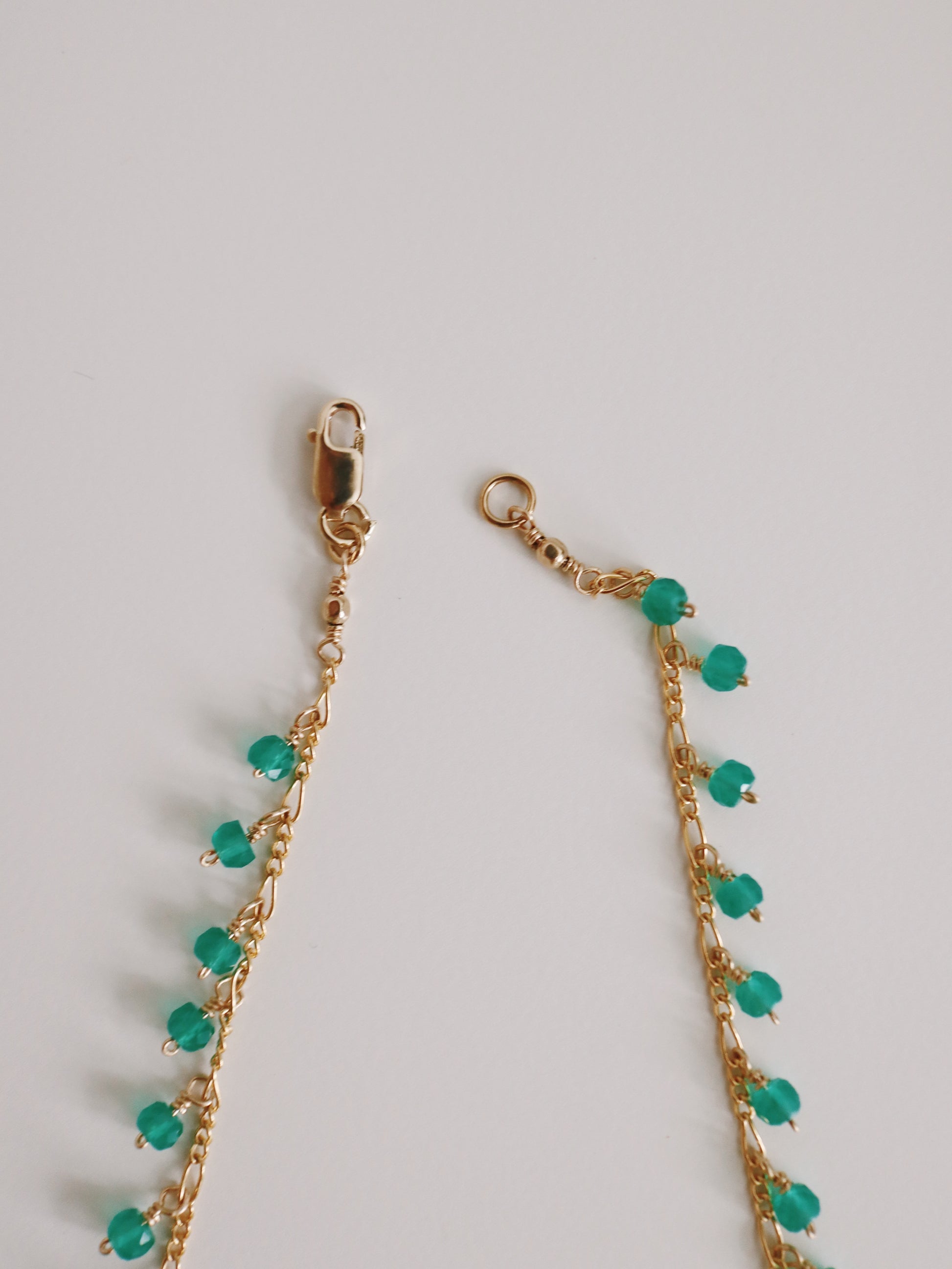 Elevate your elegance with the Ariana Necklace, featuring 14k gold-filled wire-wrapped green onyx gemstones. Its delicate, feminine design makes it an exquisite choice for layering, adding a subtle sophistication to any outfit. This necklace is also waterproof, ensuring lasting beauty and durability for everyday wear.
