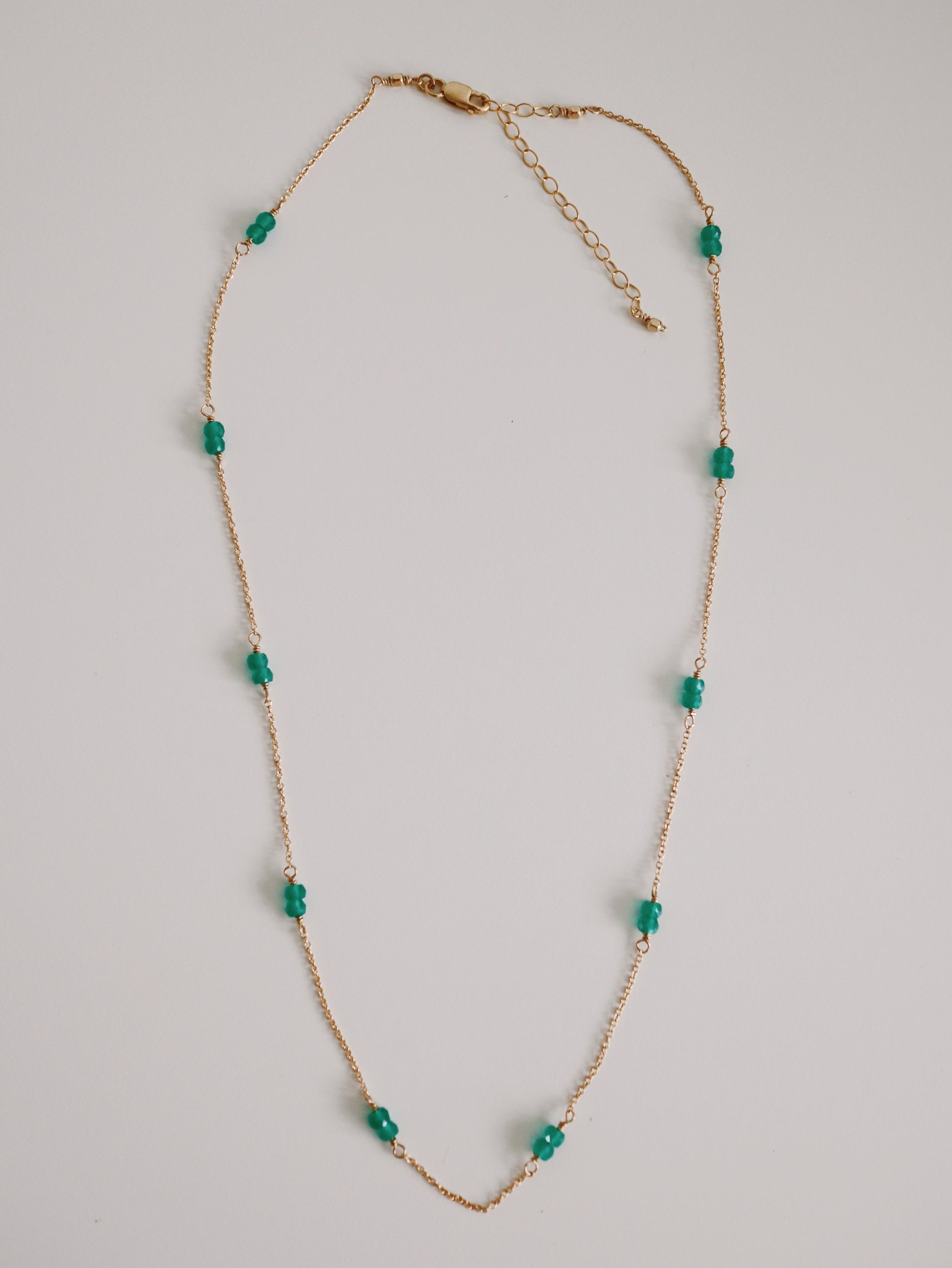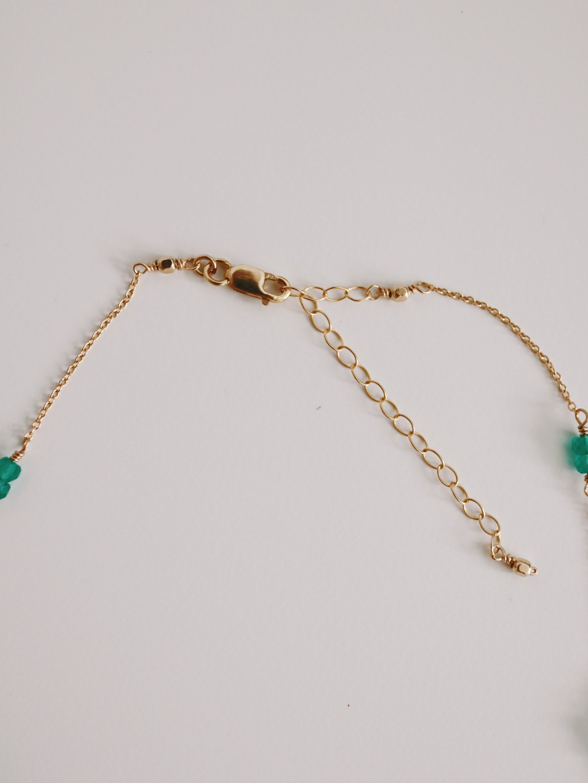 Elevate your elegance with the Madeline Necklace, featuring 14k gold-filled wire-wrapped green onyx gemstones. Its delicate, feminine design makes it an exquisite choice for layering, adding a subtle sophistication to any outfit. This necklace is also waterproof, ensuring lasting beauty and durability for everyday wear.