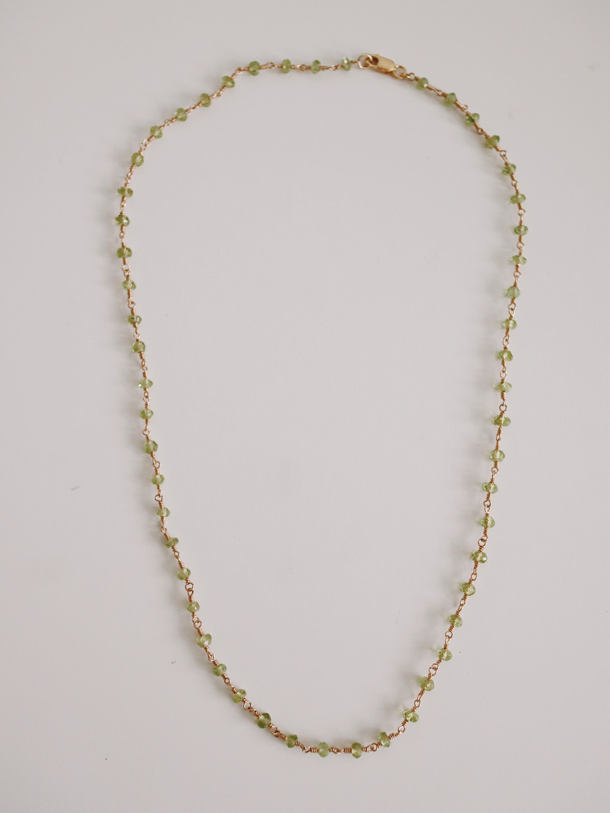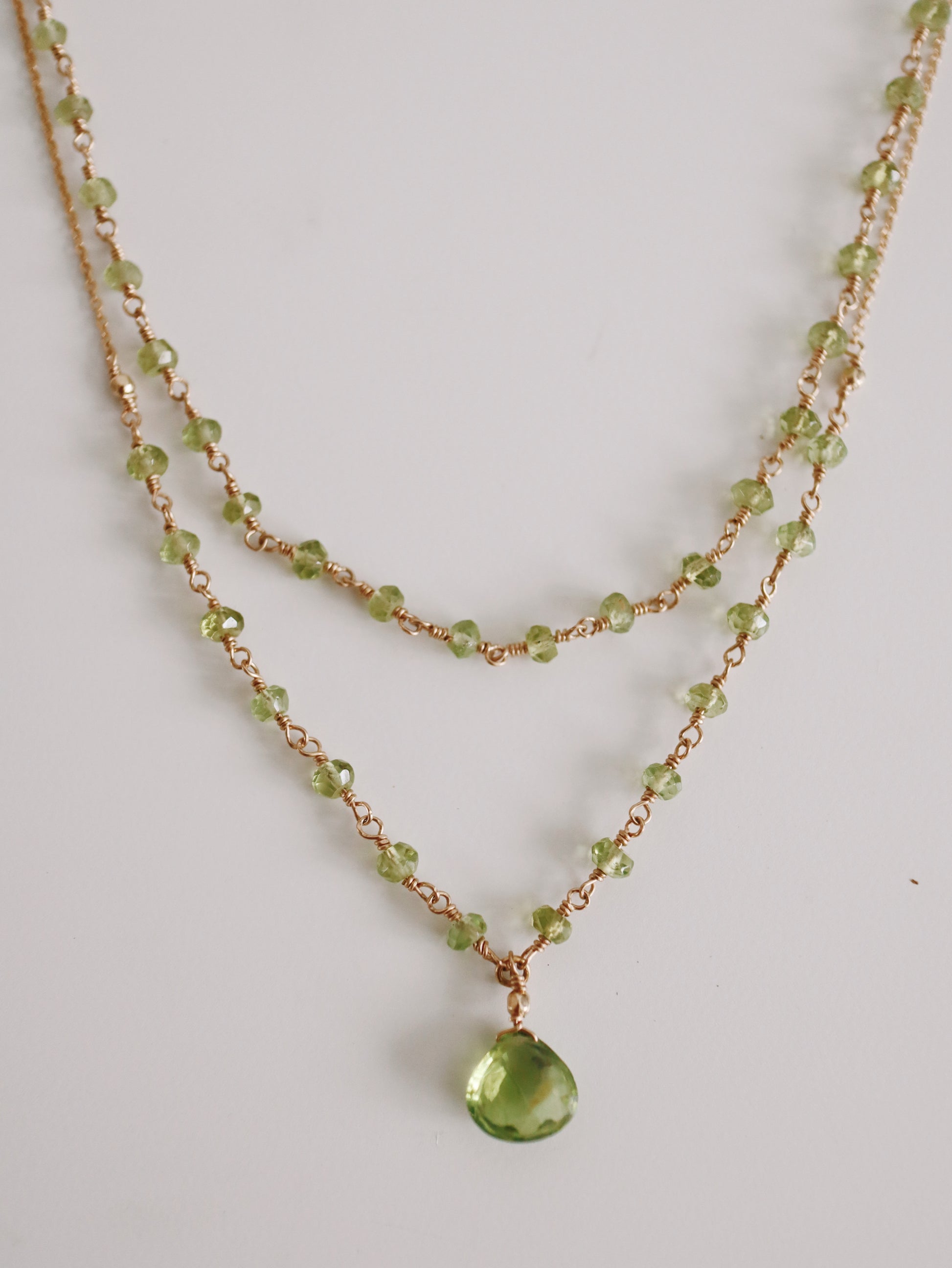 Elevate your elegance with the Eleanor Necklace, featuring 14k gold-filled wire-wrapped peridot gemstones. Its delicate, feminine design makes it an exquisite choice for layering, adding a subtle sophistication to any outfit. This necklace is also waterproof, ensuring lasting beauty and durability for everyday wear.
