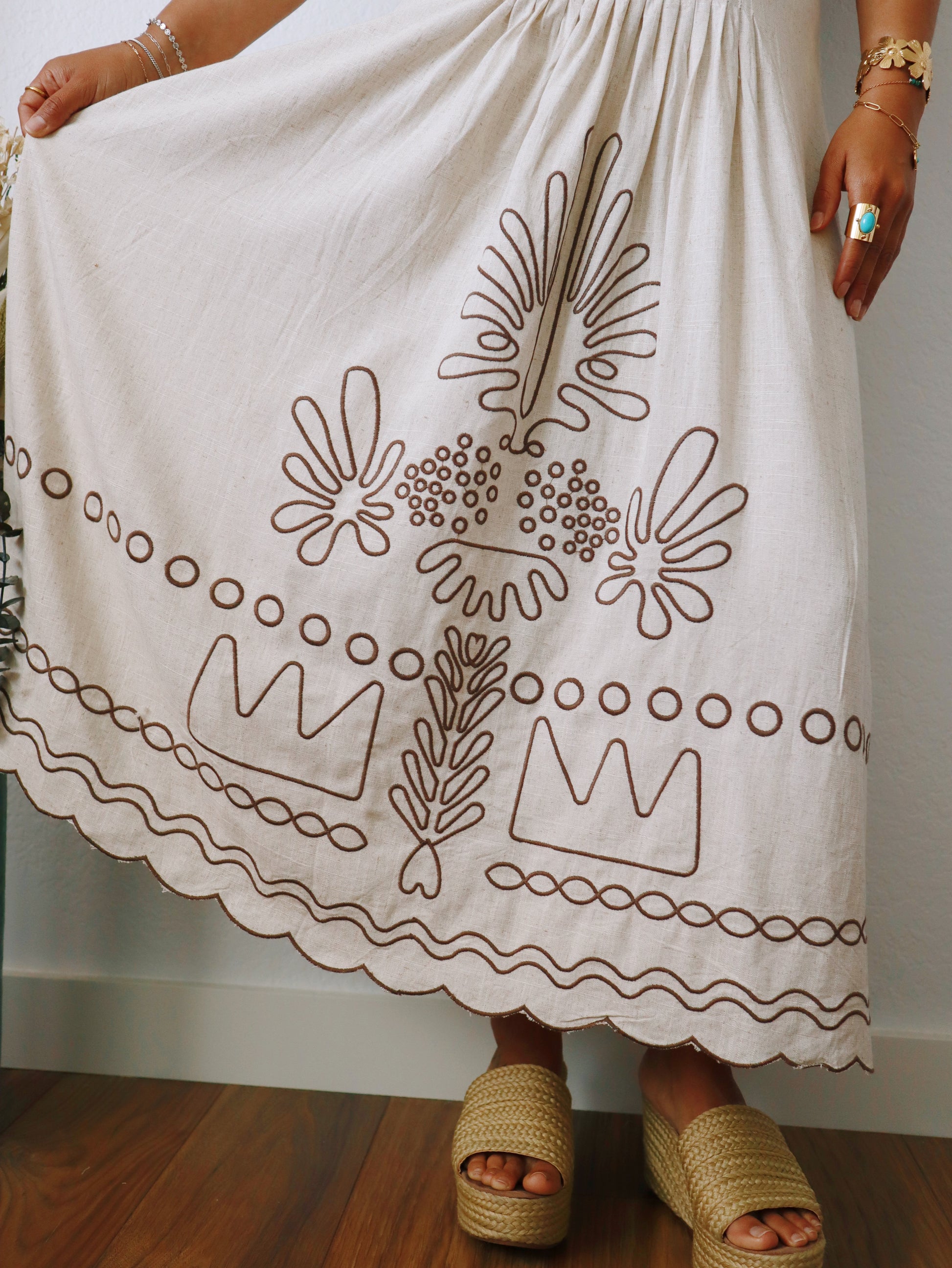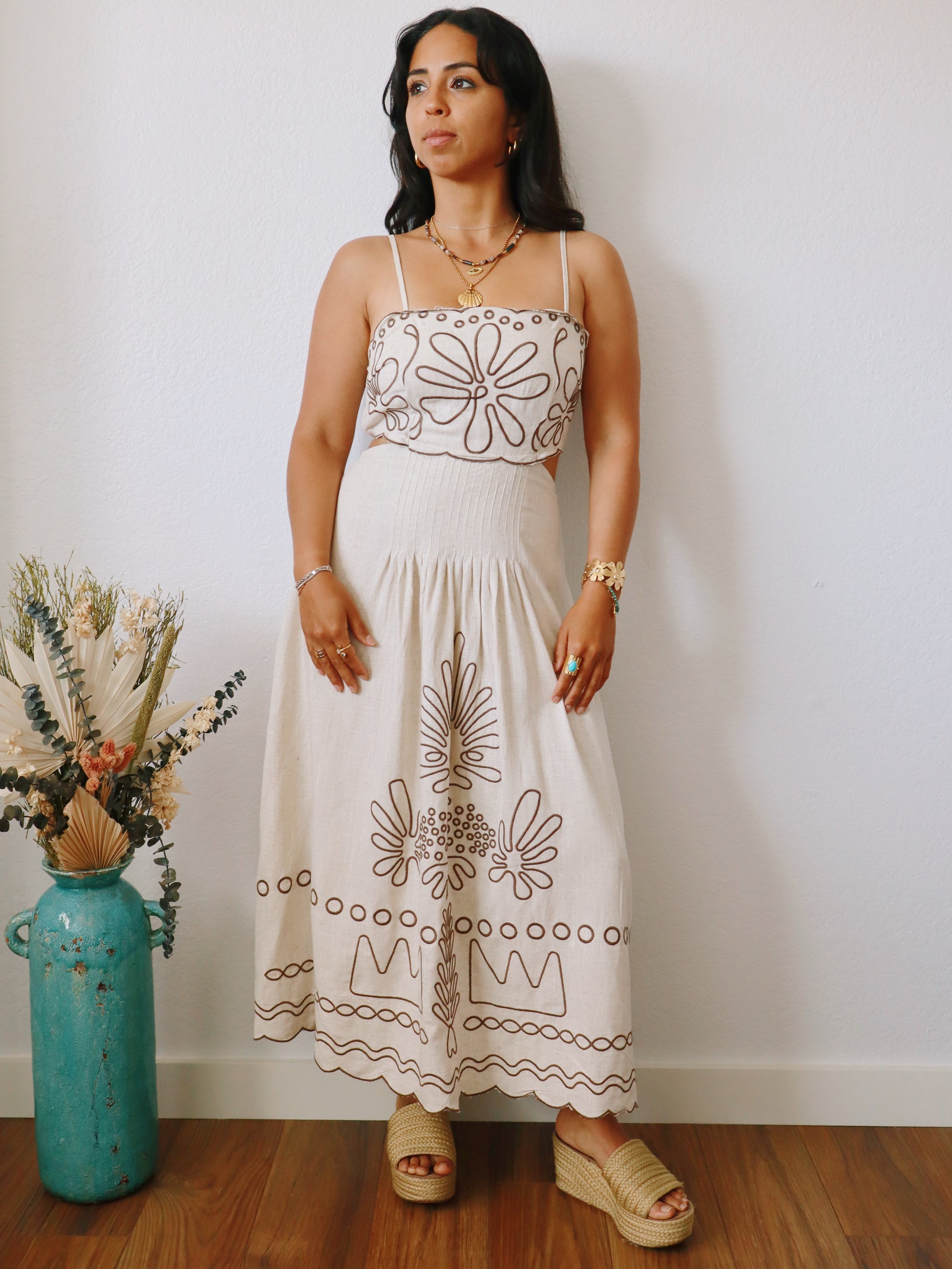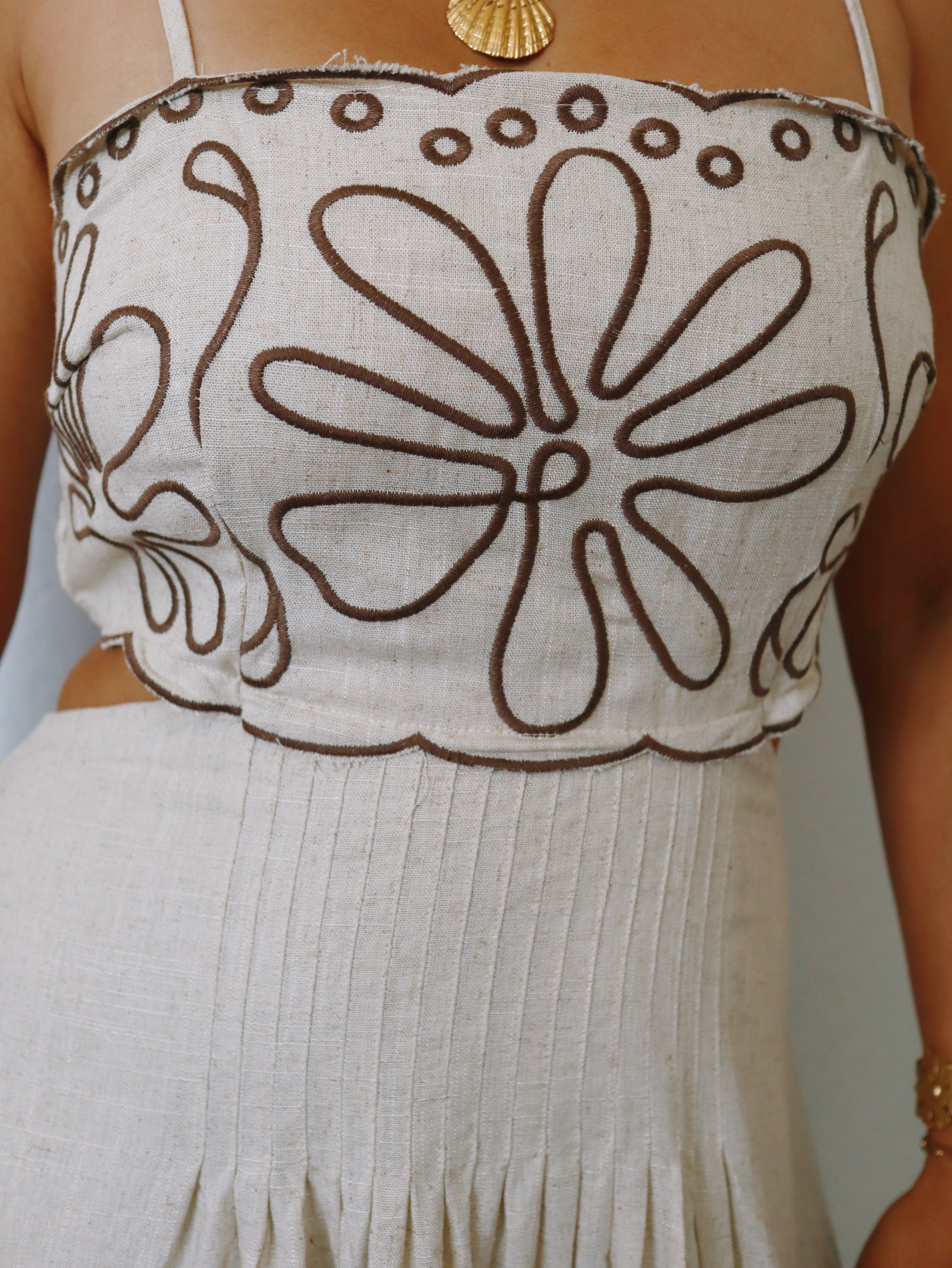 The Valentina Embroidered Dress combines comfort and style with its breathable linen blend fabric and adjustable straps for a perfect fit. Featuring a smocked back and an open back design, this midi-length dress showcases a beautiful brown embroidered pattern that adds subtle sophistication. Ideal for brunch, vacations, resort days, or vineyard visits, it effortlessly elevates your look while keeping you cool and confident.