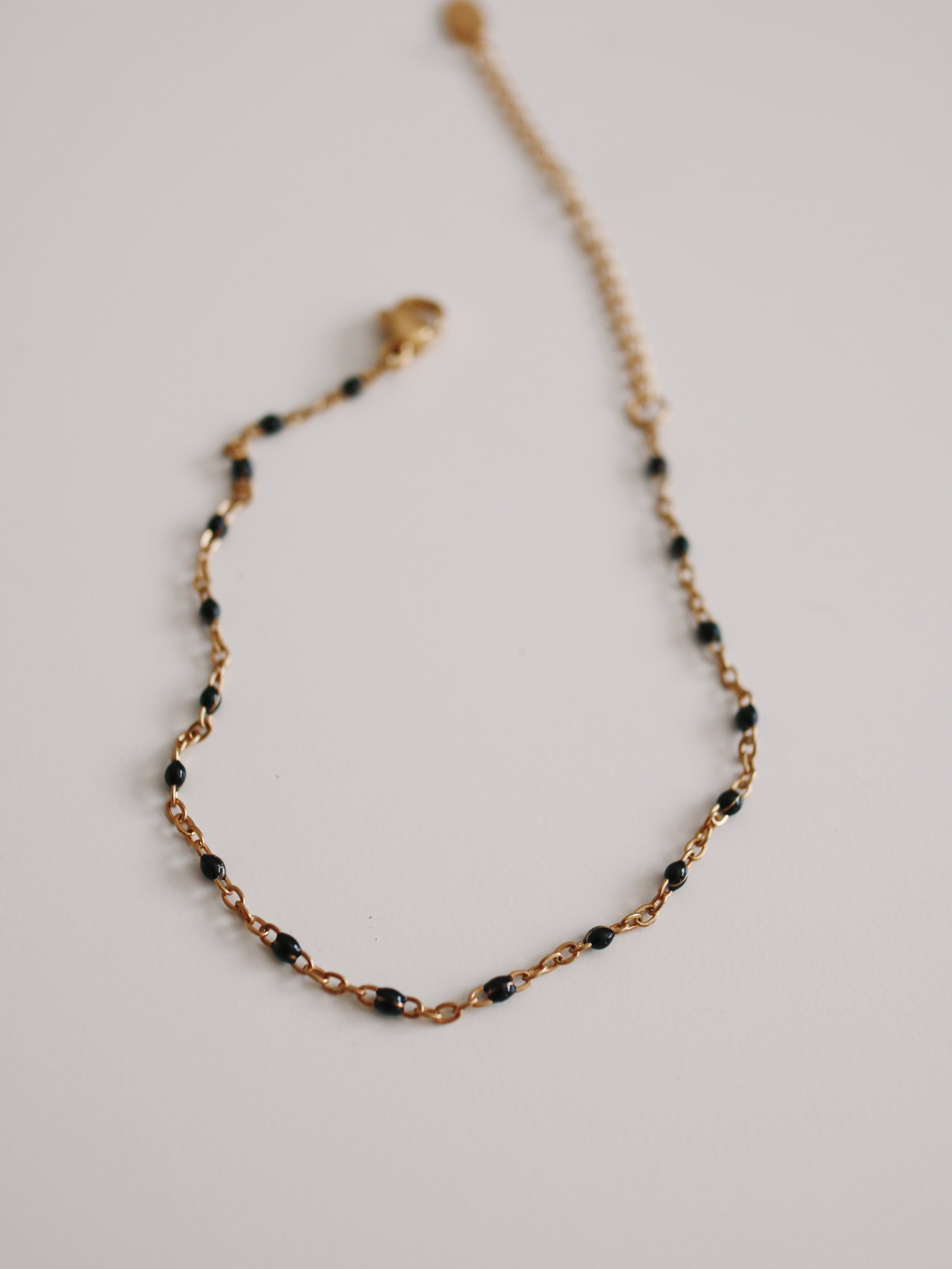 The Black Satellite Bracelet/Anklet features a sleek black enamel accent with a tarnish-free, waterproof, and hypoallergenic design. Its dainty style lets you wear it comfortably as a bracelet or anklet, while stacking beautifully with other jewelry for a refined, layered look.