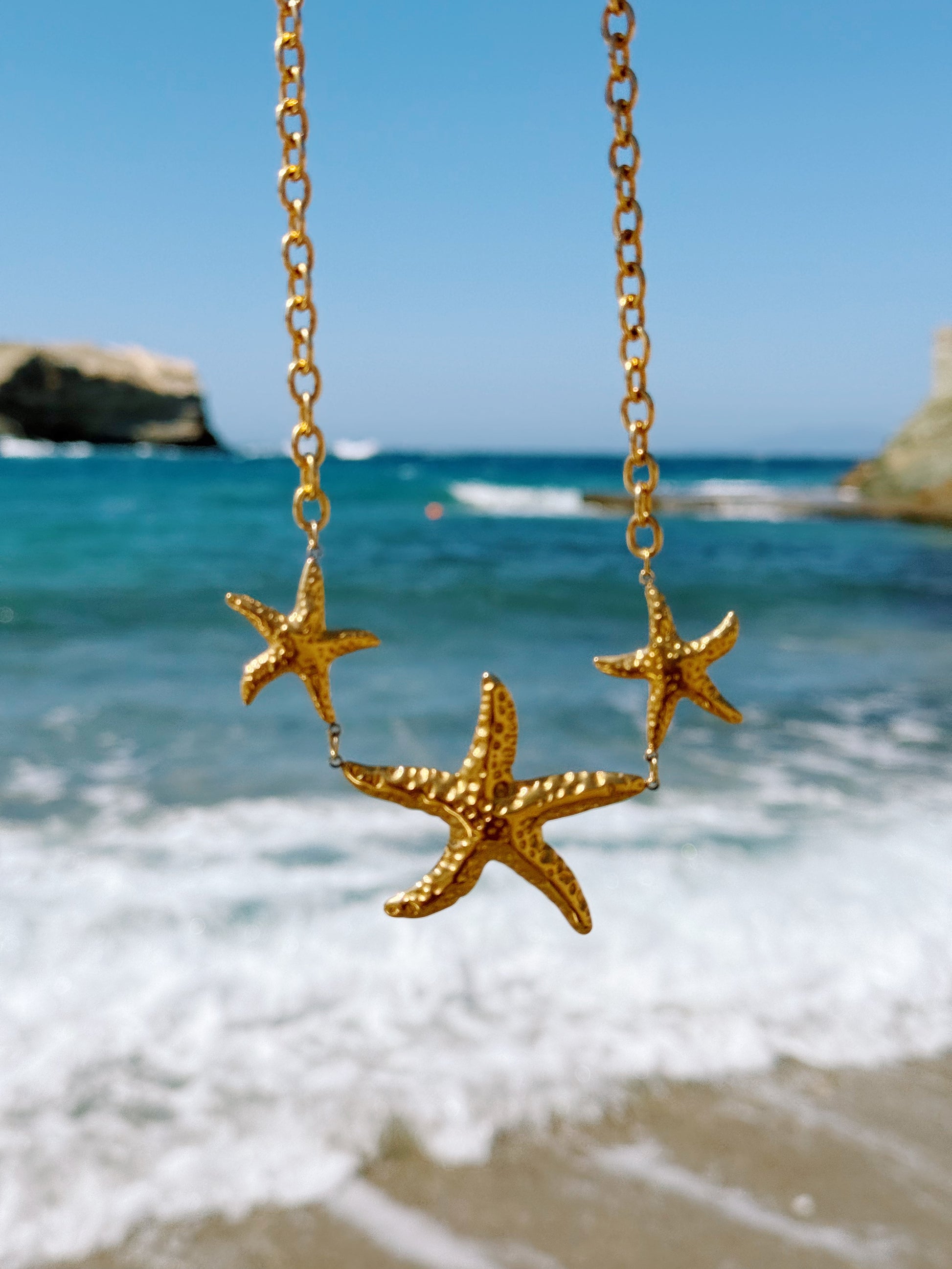 Make a bold statement with the Lanai Starfish Necklace, featuring three delicate starfish charms elegantly arranged on a chunky paperclip chain. The adjustable length ensures a perfect fit, while its waterproof, tarnish-free, and hypoallergenic design guarantees lasting beauty and comfort. This piece effortlessly combines sophistication with seaside-inspired charm.