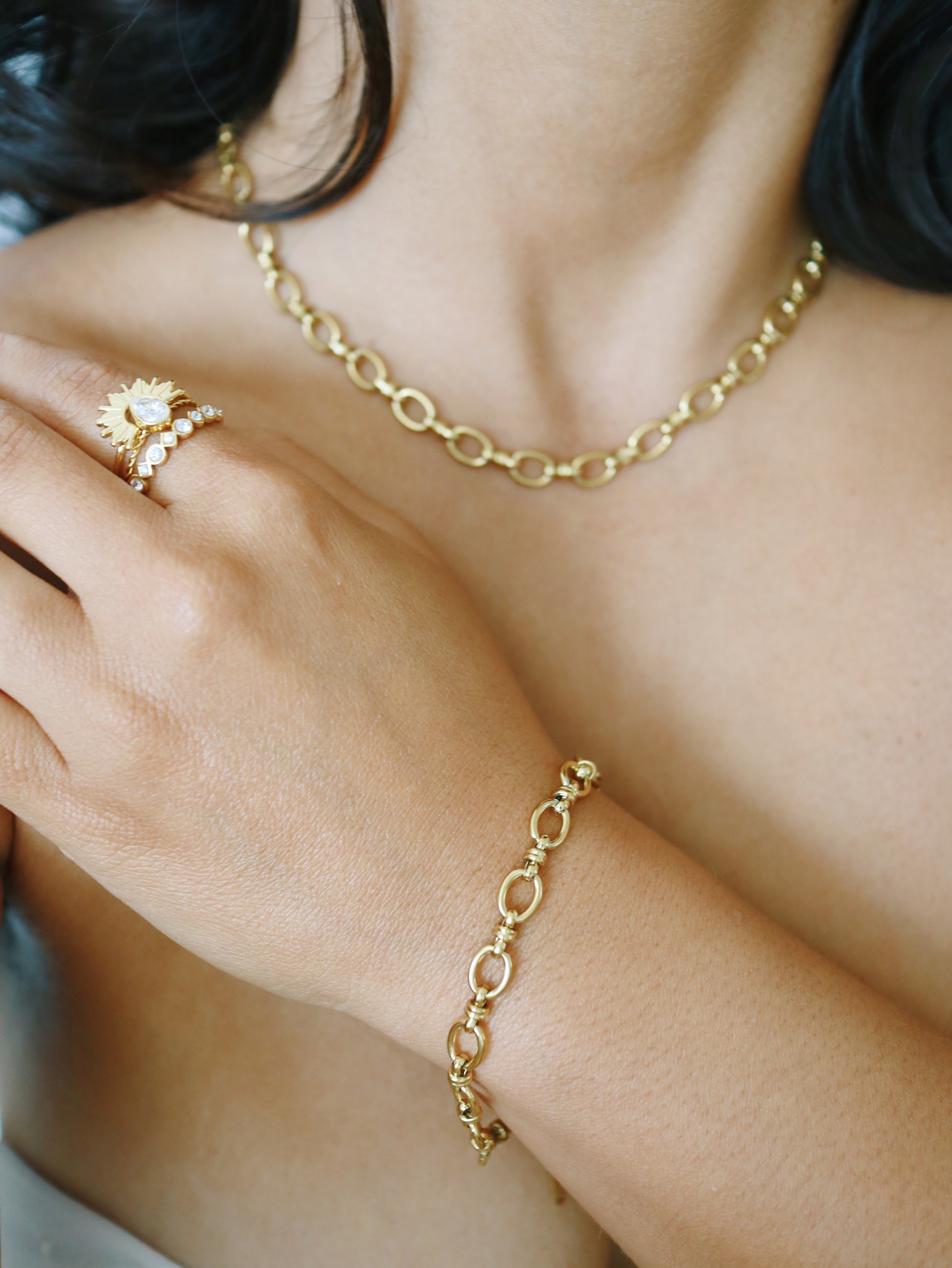 This elegant Emma Necklace features 18k gold plating over durable stainless steel, ensuring it remains tarnish-free and radiant. Its chic design makes it a perfect piece for layering, adding a refined touch to any outfit. Pair it effortlessly with our Emma Bracelet to complete a sophisticated set.