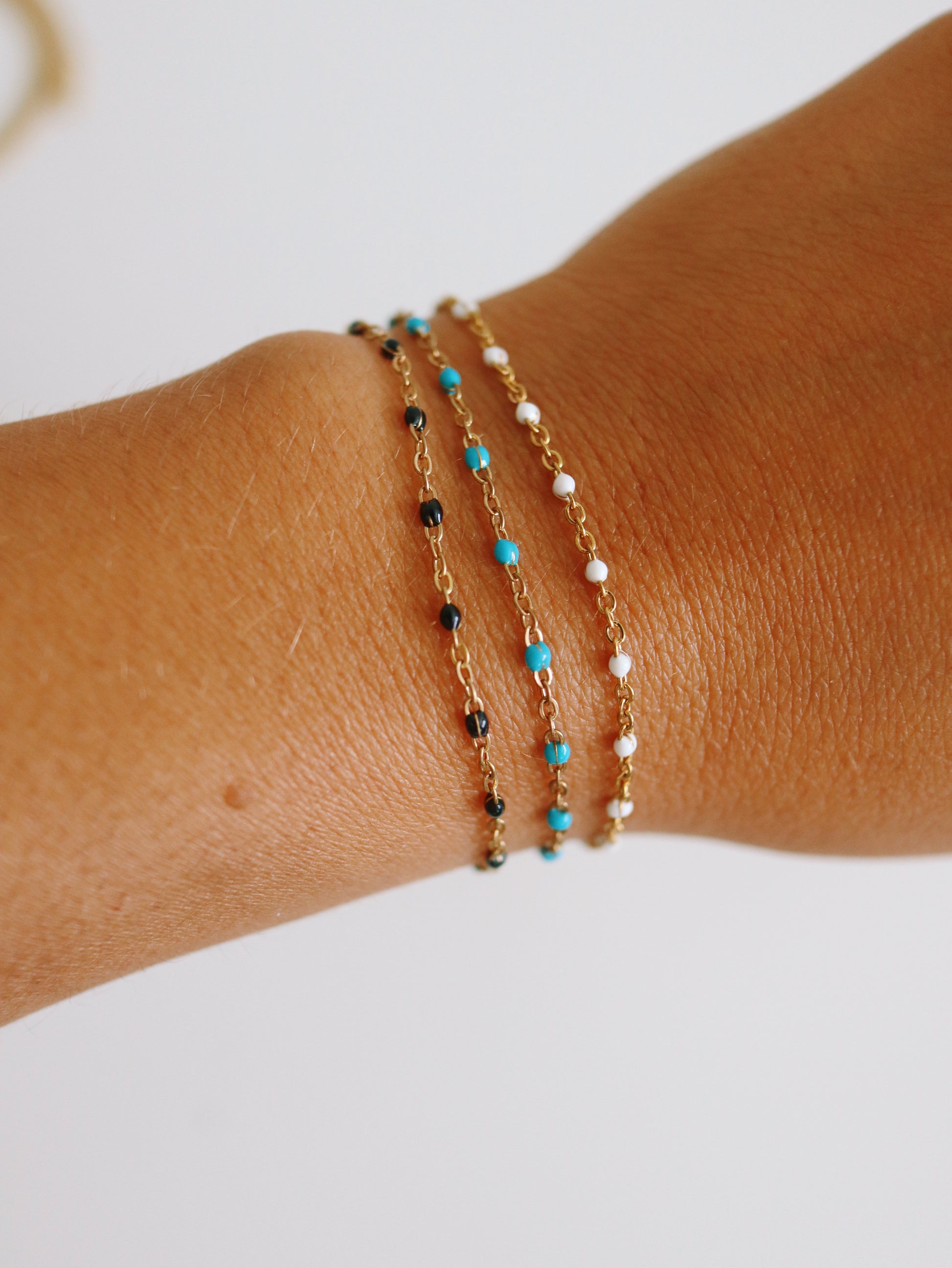 The White Satellite Bracelet/Anklet features a sleek white enamel accent with a tarnish-free, waterproof, and hypoallergenic design. Its dainty style lets you wear it comfortably as a bracelet or anklet, while stacking beautifully with other jewelry for a refined, layered look.