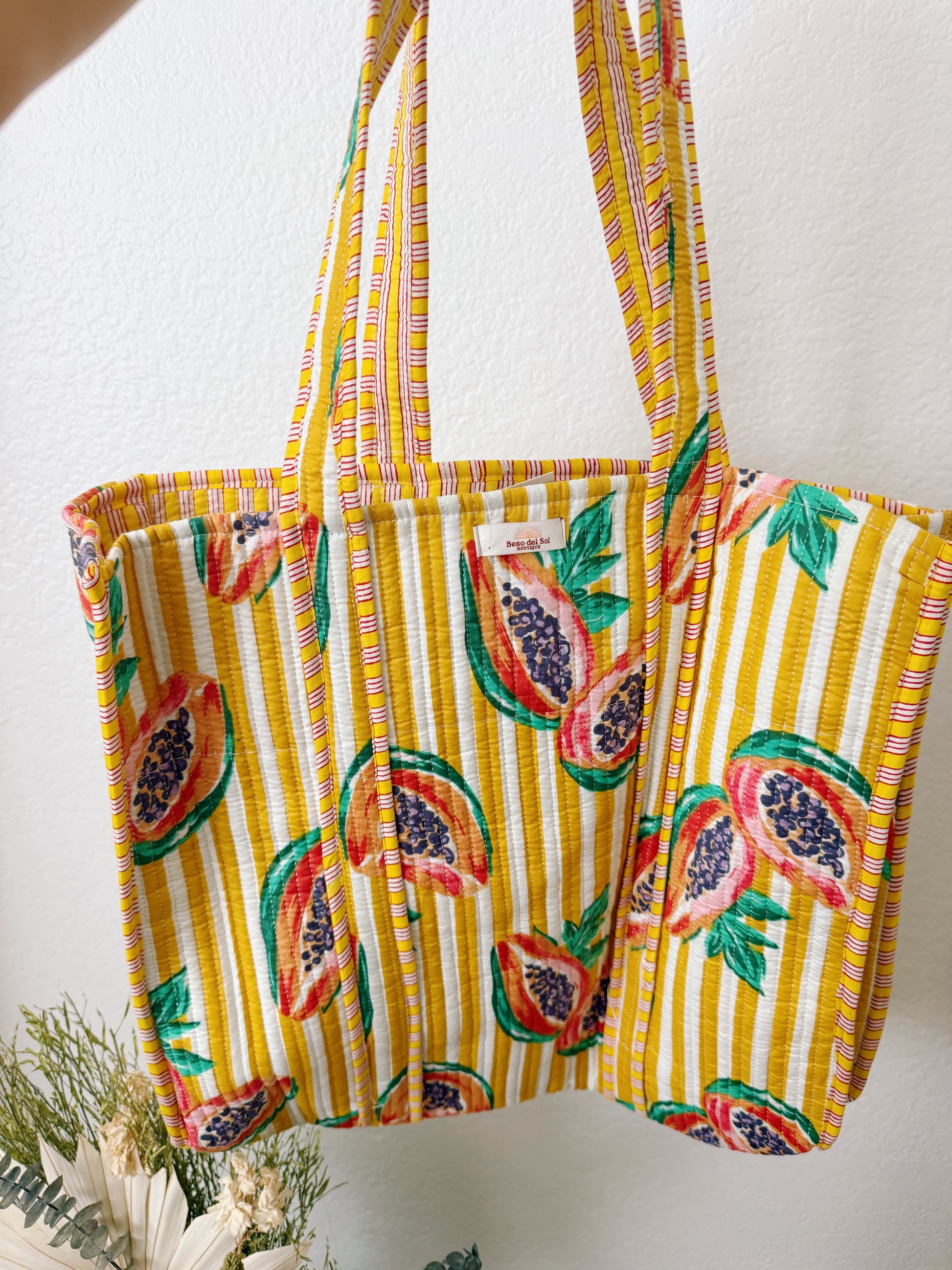 Introducing the Yellow Papaya Quilted Tote - the perfect blend of fashion and function. Handmade with reversible quilted cotton and a stunning playful design, this tote is perfect for carrying laptops, books, or even groceries. Plus, its compact design easily packs for all your traveling adventures.