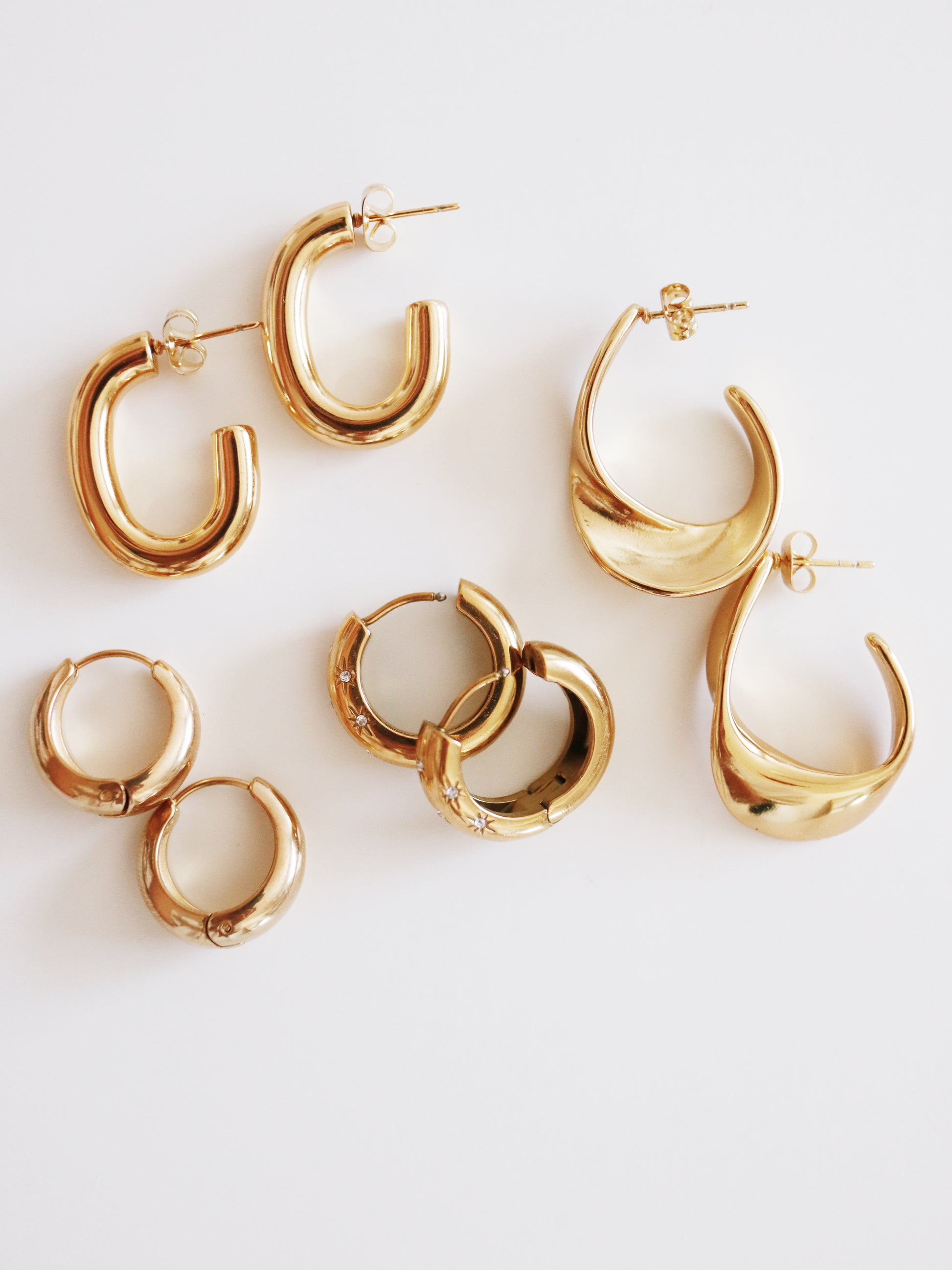 The Andrea Gold Hoops offer a minimalist design perfect for daily wear. Lightweight and hypoallergenic, they provide all-day comfort without irritation. Waterproof and durable, these hoops are ideal for stacking, allowing you to create a personalized, elegant look that complements any outfit effortlessly.