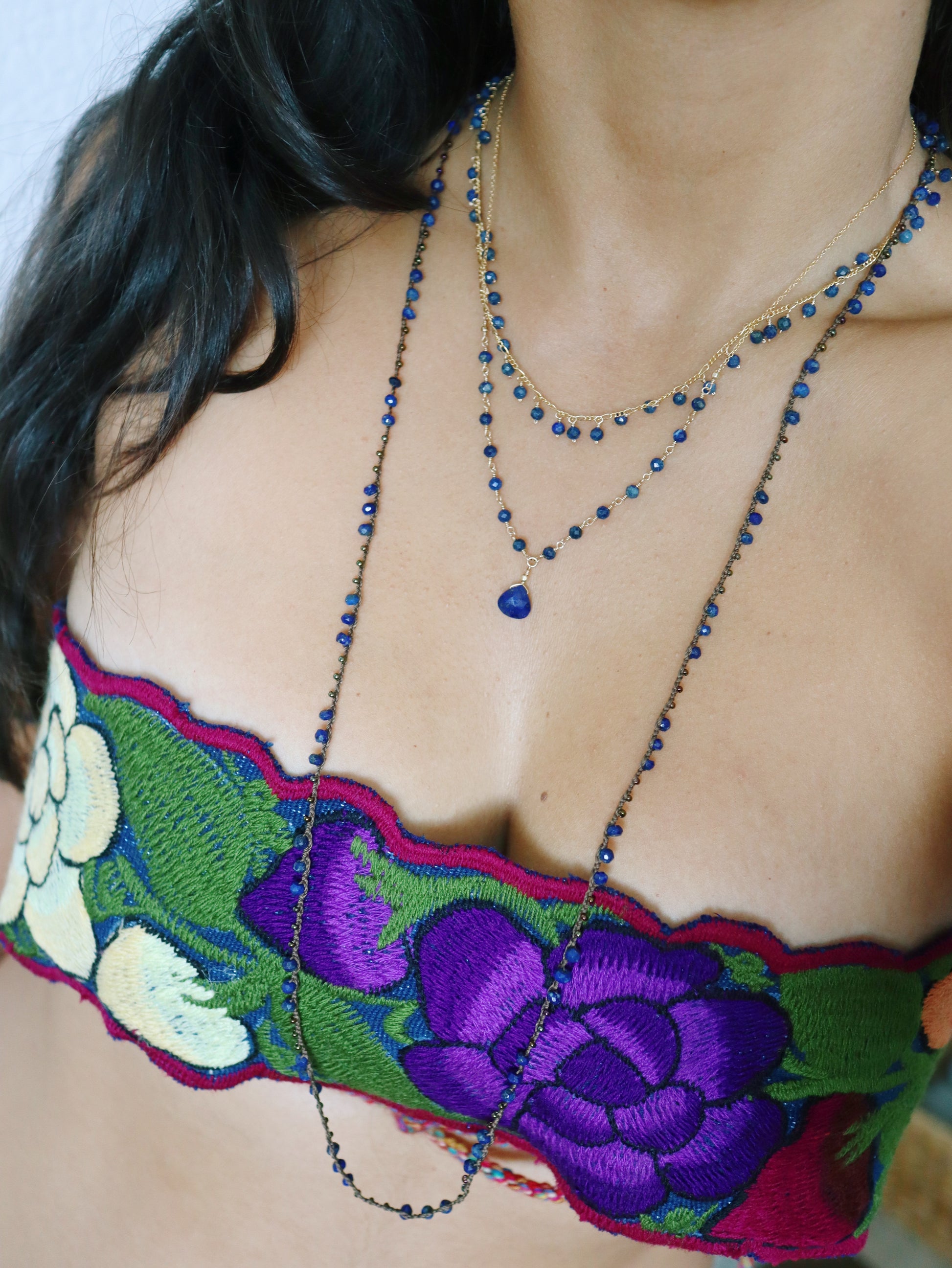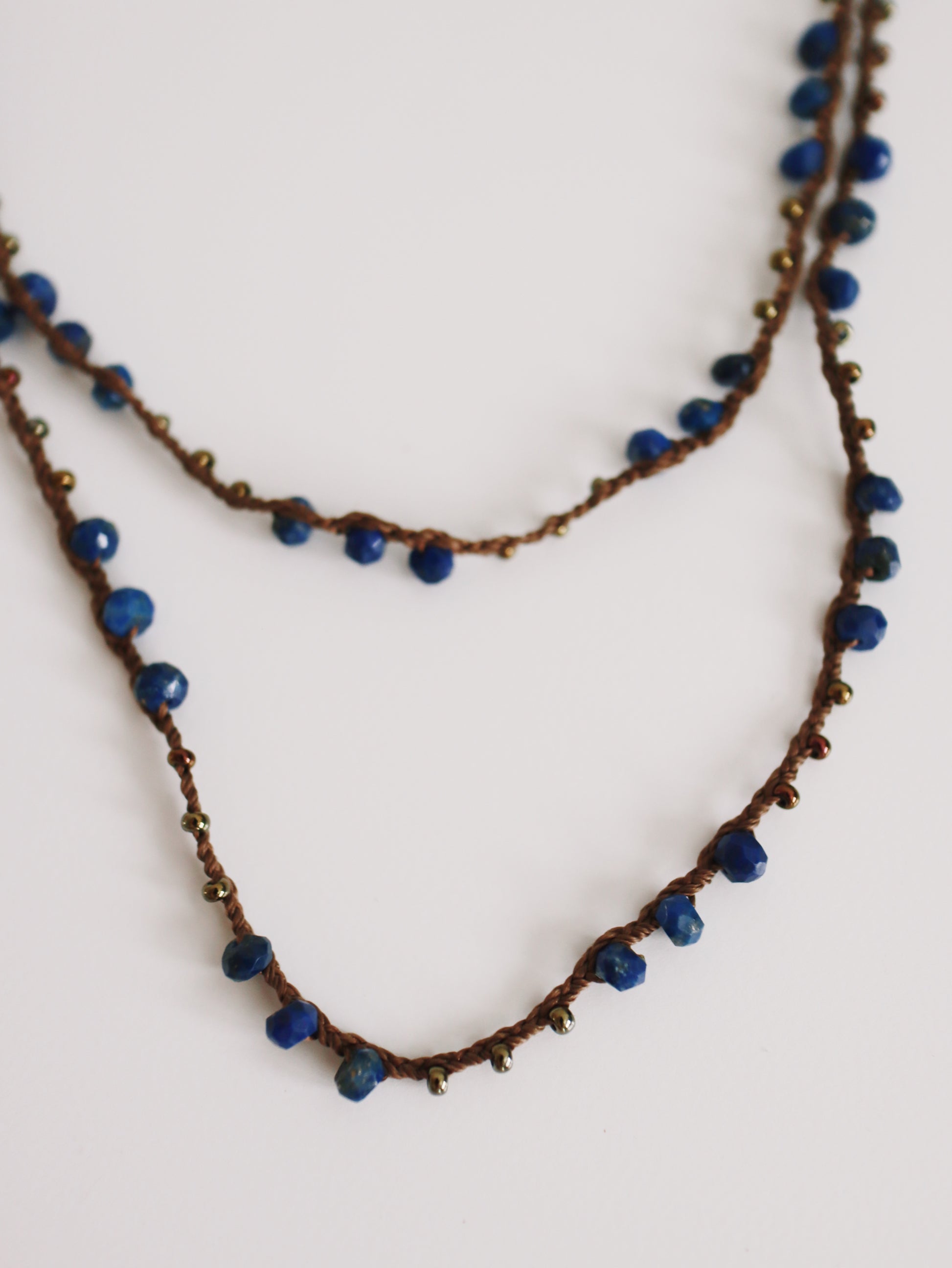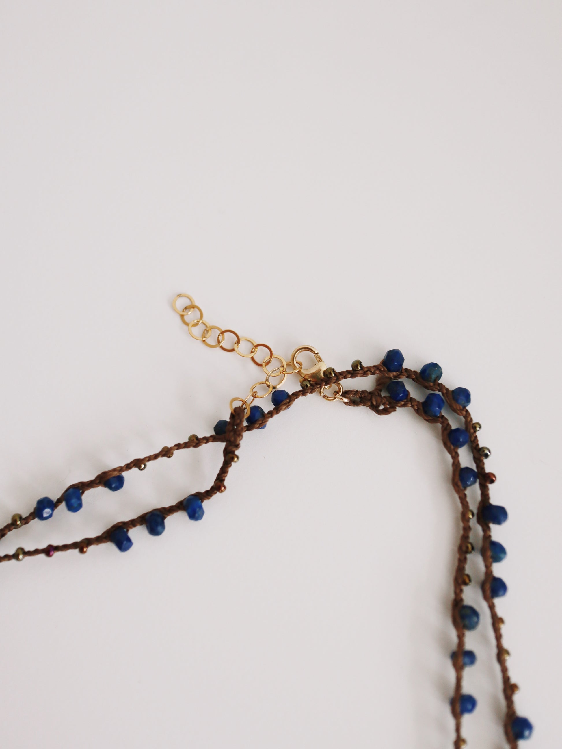 Elevate your elegance with the Annabeth Necklace, featuring a 14k gold-filled clasp and silky threaded lapiz azuli gemstones. Its delicate, feminine design makes it an exquisite choice for layering, adding a subtle sophistication to any outfit. This necklace is also waterproof, ensuring lasting beauty and durability for everyday wear.