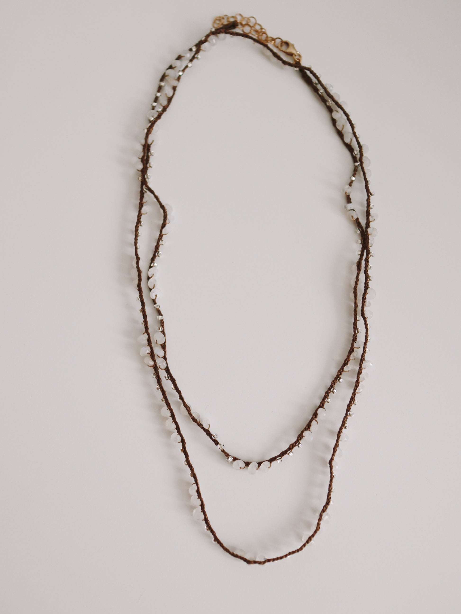 Elevate your elegance with the Avalon Necklace, featuring a 14k gold-filled clasp and silky threaded moonstone gemstones. Its delicate, feminine design makes it an exquisite choice for layering, adding a subtle sophistication to any outfit. This necklace is also waterproof, ensuring lasting beauty and durability for everyday wear.