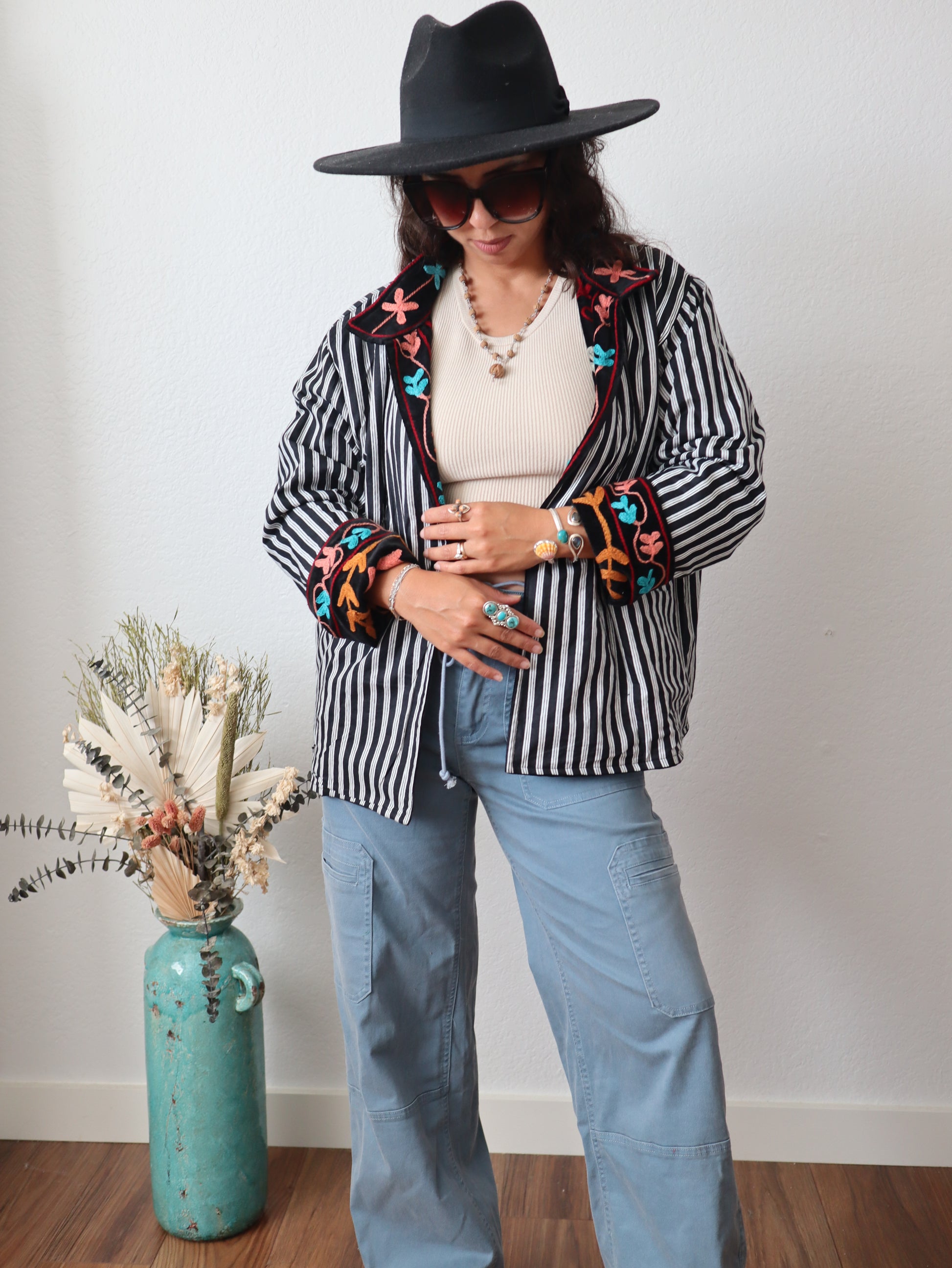 The Black Pine Cotton Jacket represents timeless versatility meets contemporary design. Fashioned from pure cotton velvet and embroidery, this statement piece drapes in an intentionally oversized silhouette that exudes casual refinement. Flip it inside out to reveal an entirely different multicolor palette—the reversible construction ensures two complete looks from one exceptional garment. The absence of buttons creates an uninterrupted, streamlined aesthetic that speaks to discerning taste. Available in one universal size.