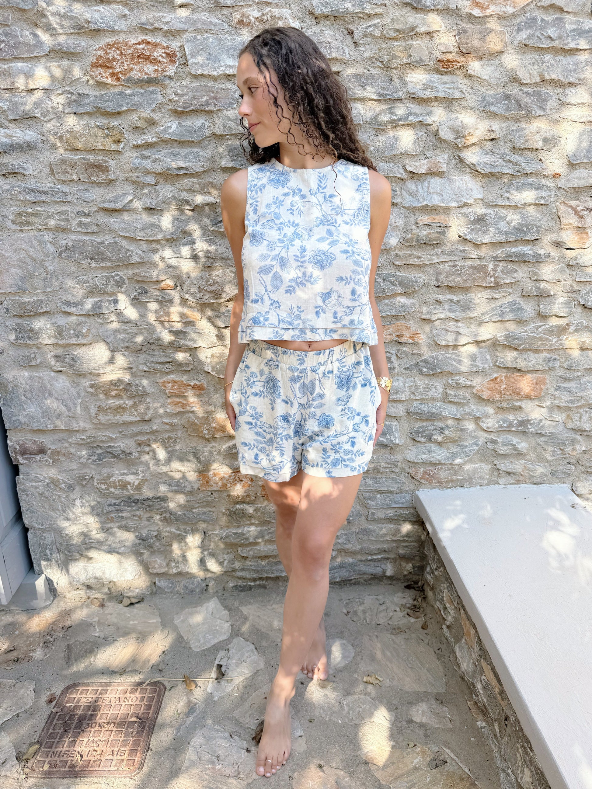 The Blue Rose Linen Top offers a sophisticated blend of softness and elegance with its linen blend fabric and delicate blue floral pattern. Designed as a tank top, it features a unique layered hem detail that adds subtle dimension and refinement, making it an ideal choice for a polished, effortless style. Make it a set with the Blue Rose Linen Shorts and Pants