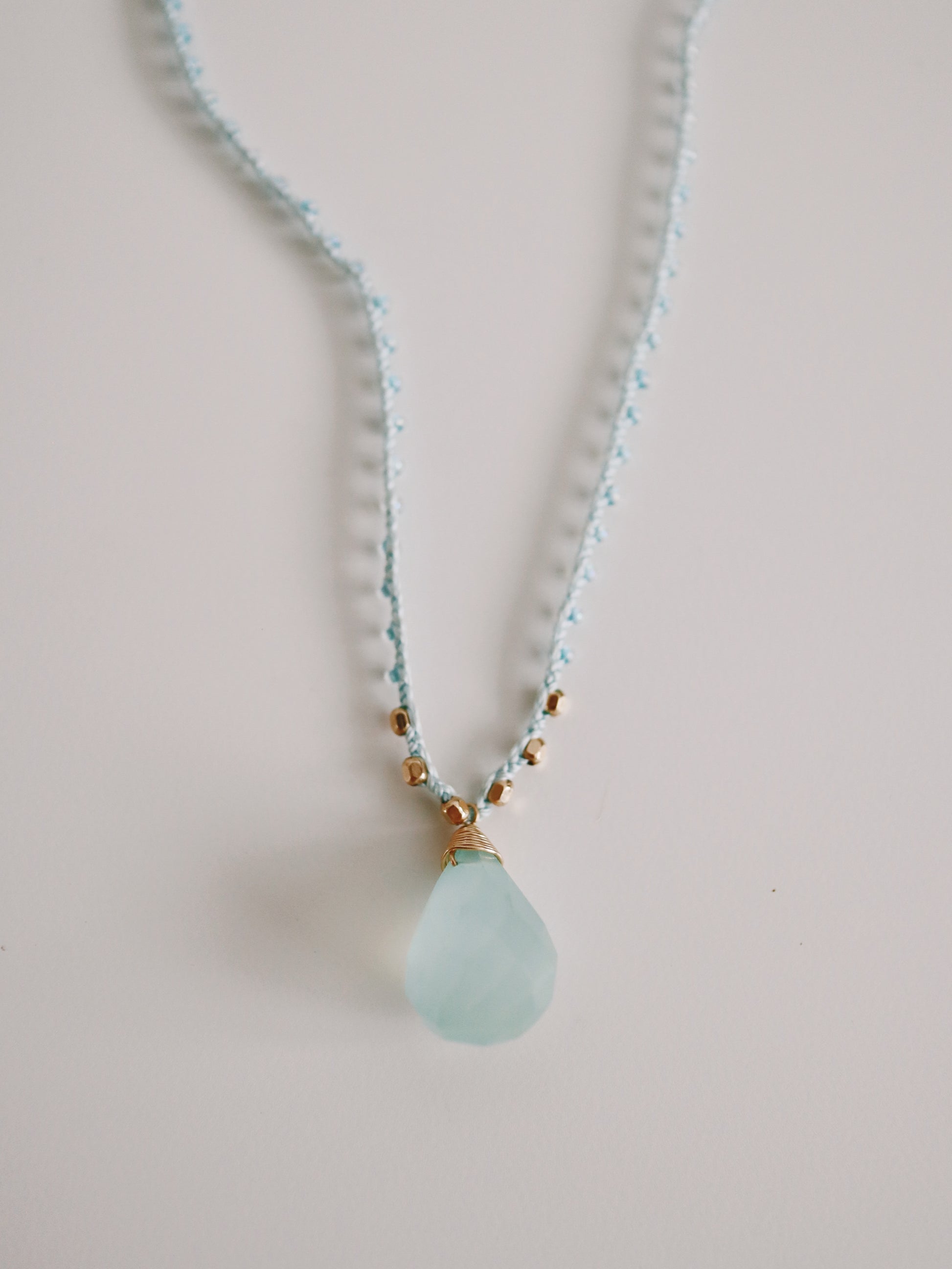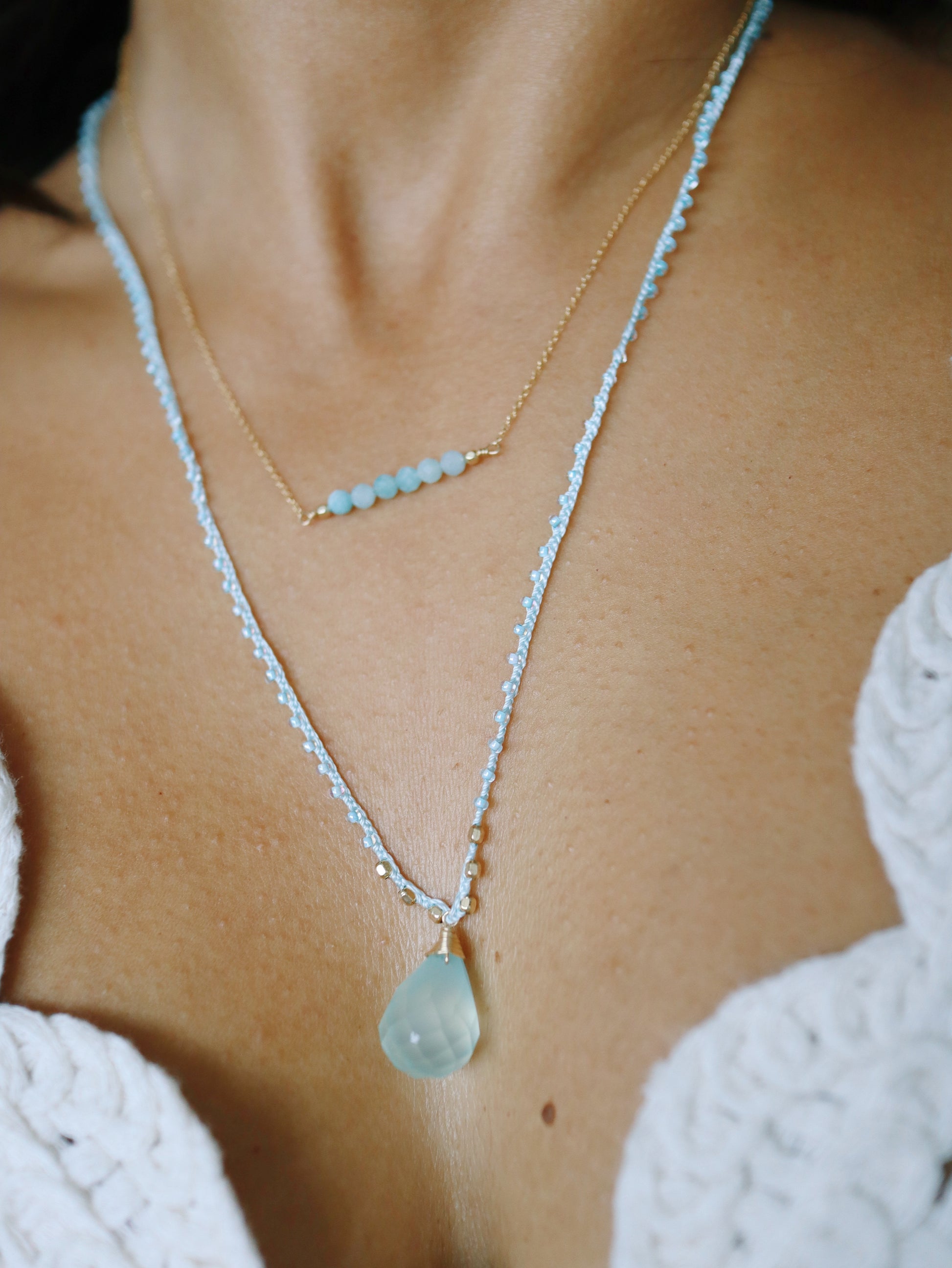 Elevate your elegance with the Clara Necklace, featuring a 14k gold-filled wire-wrapped aquamarine center gemstone and gold filled beads. Its delicate, feminine design makes it an exquisite choice for layering, adding a subtle sophistication to any outfit. This necklace is also waterproof, ensuring lasting beauty and durability for everyday wear.