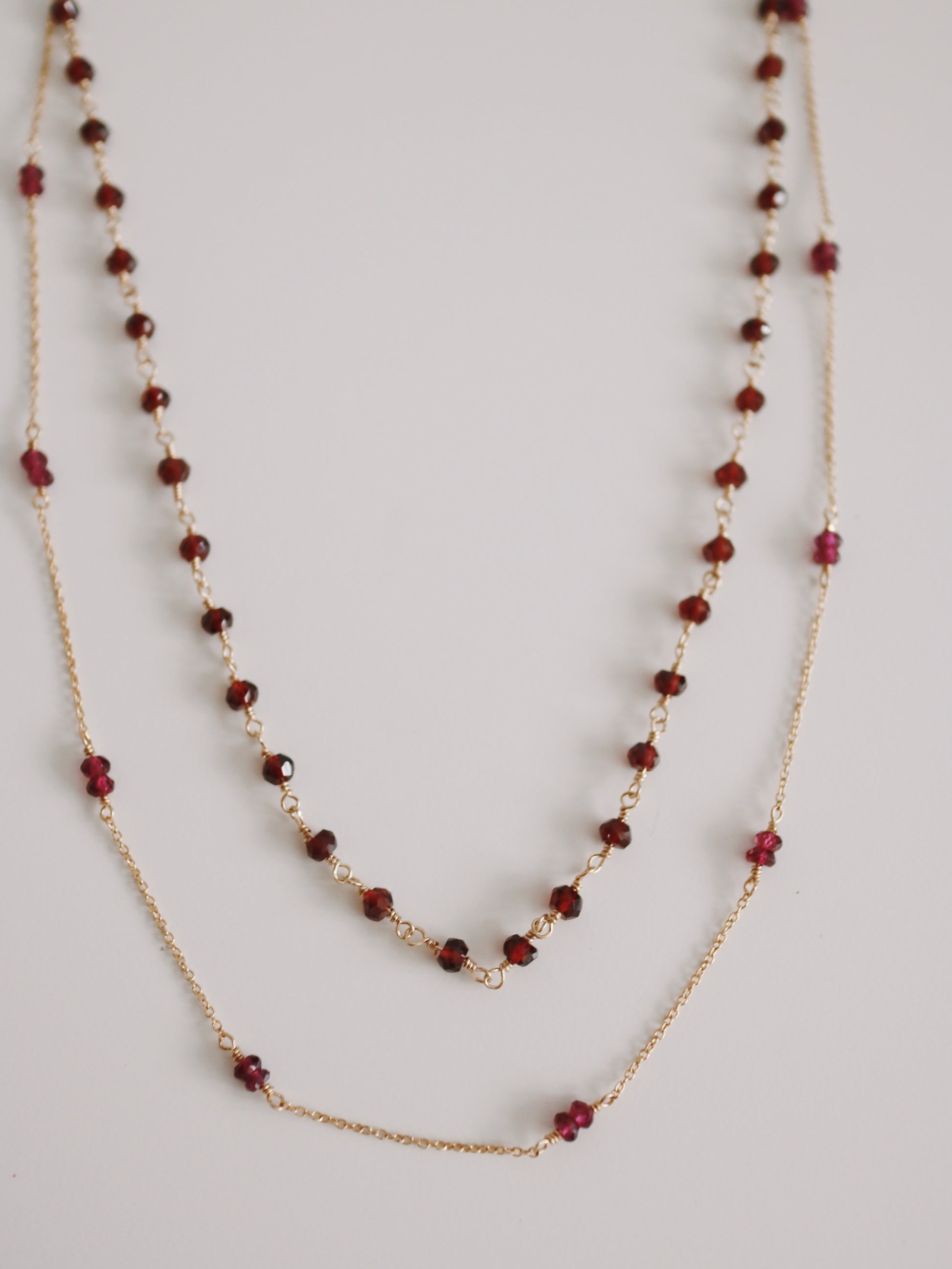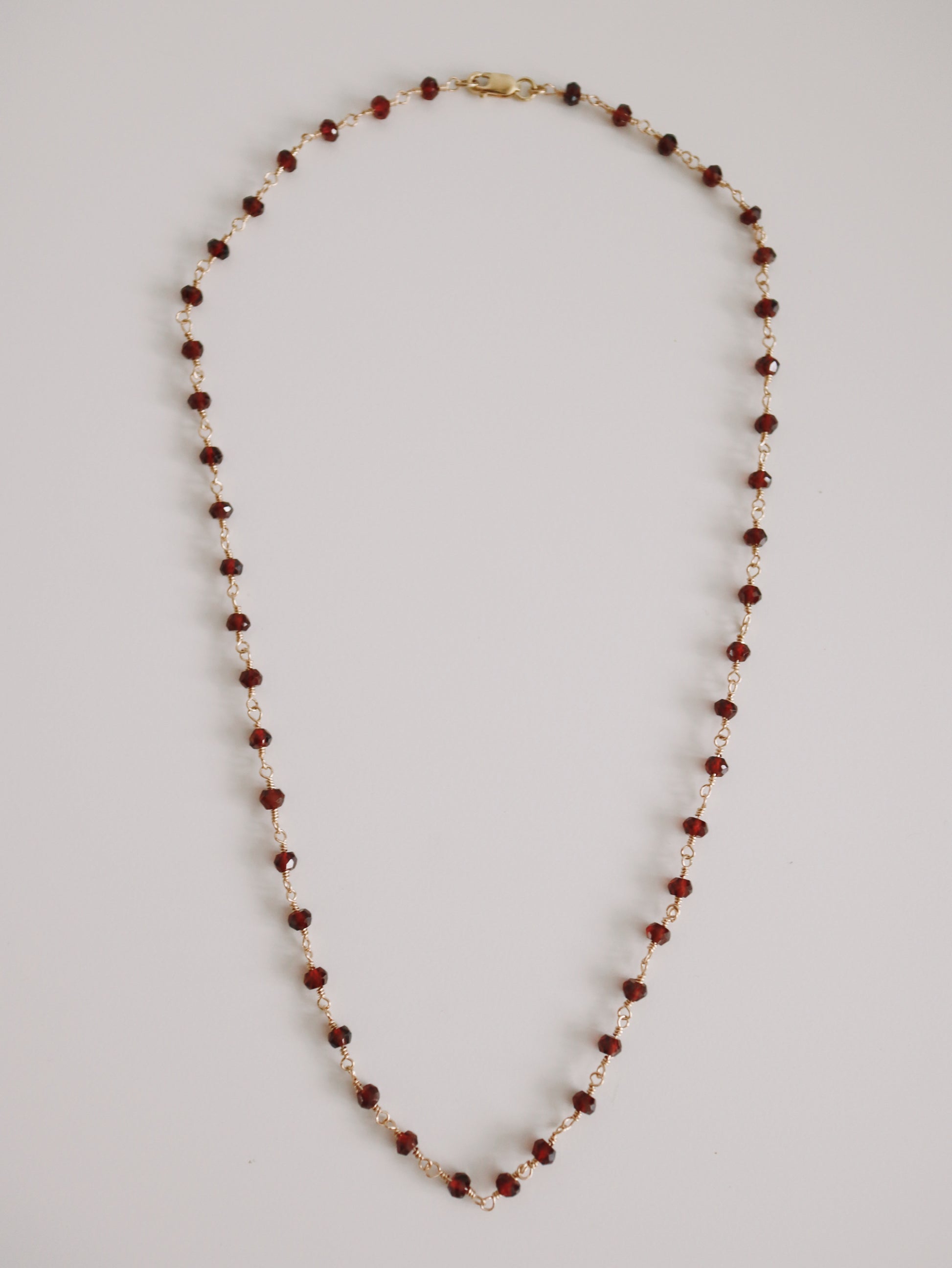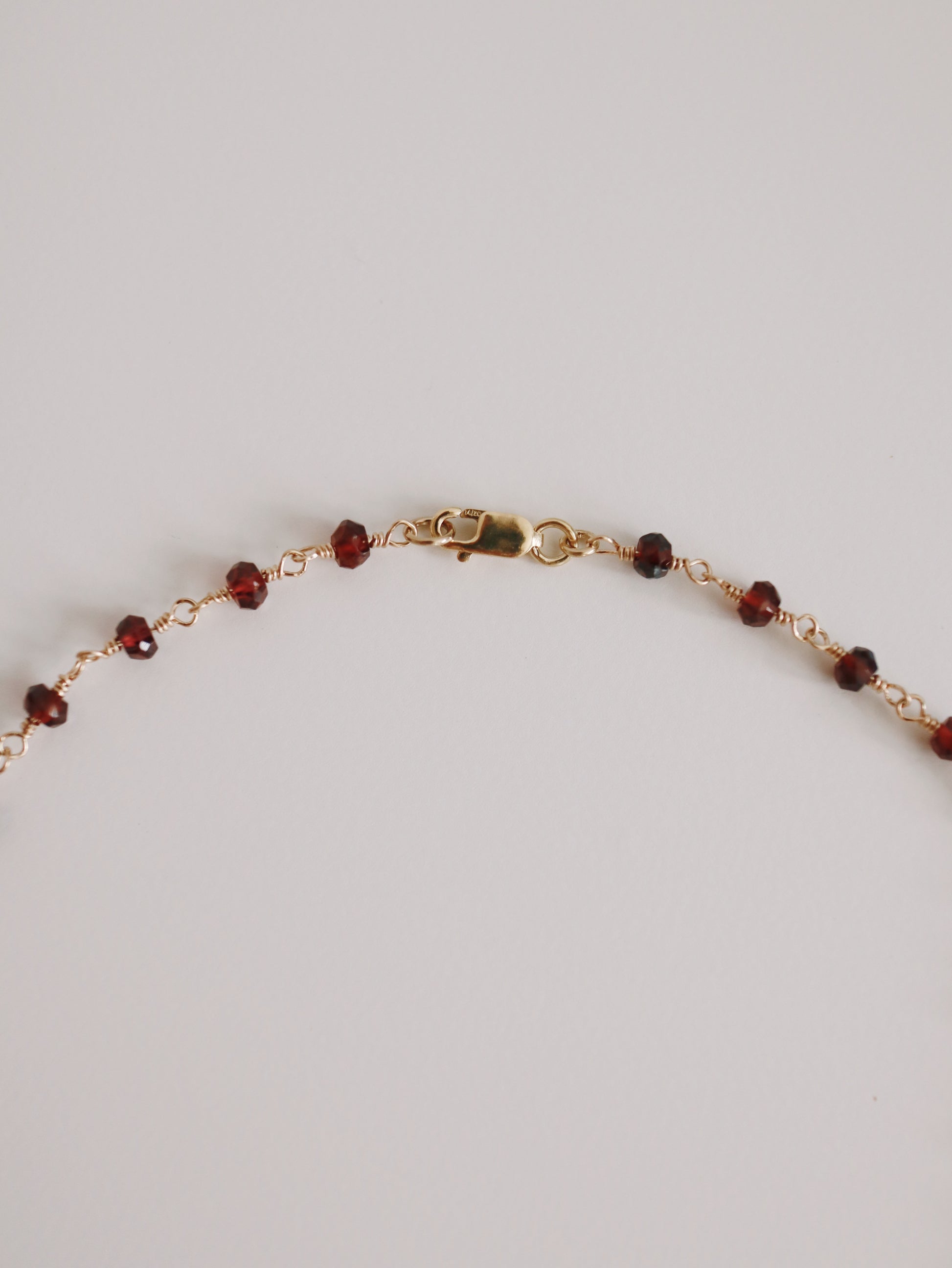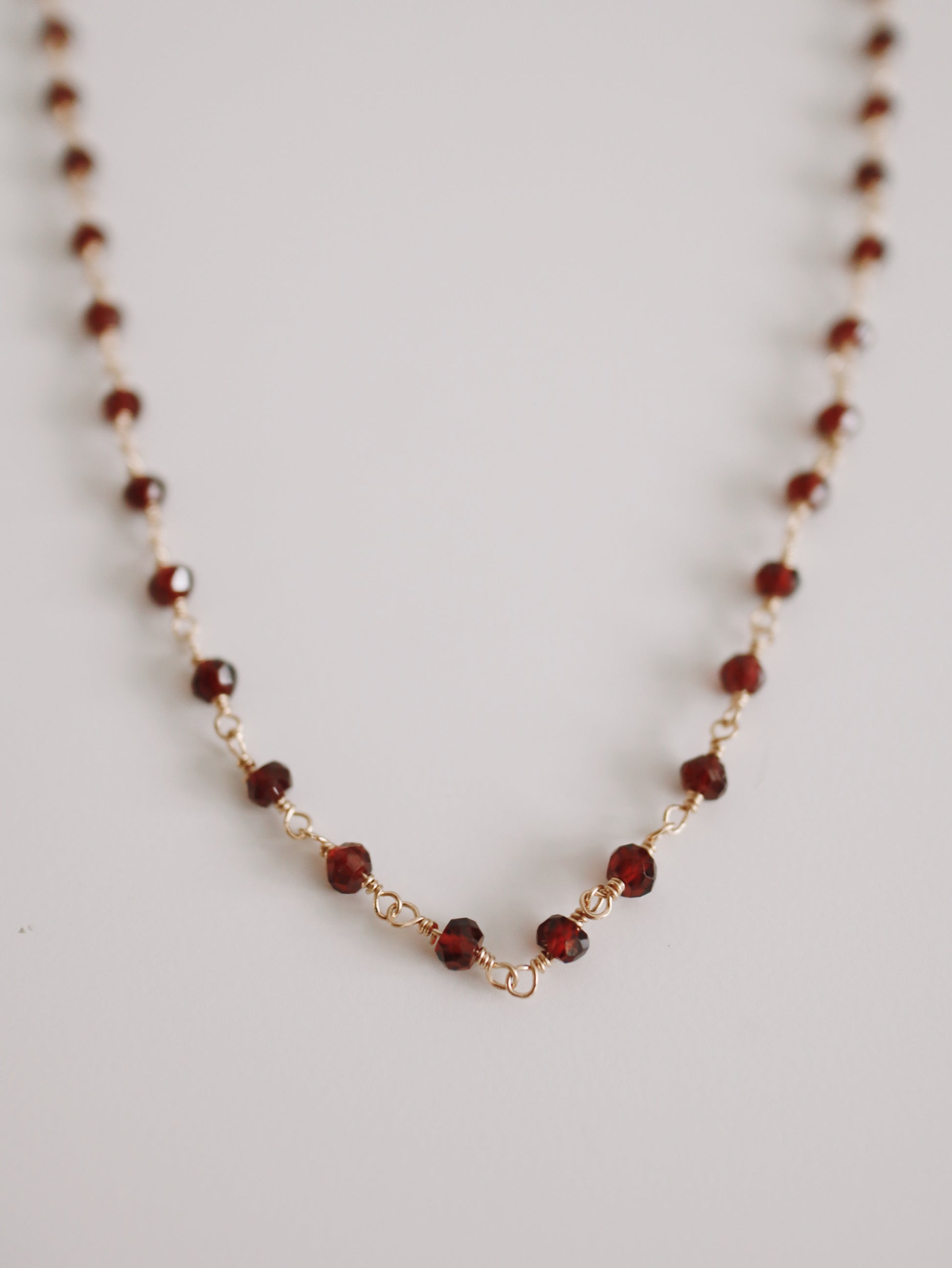 Elevate your elegance with the Edith Necklace, featuring 14k gold-filled wire-wrapped garnet gemstones. Its delicate, feminine design makes it an exquisite choice for layering, adding a subtle sophistication to any outfit. This necklace is also waterproof, ensuring lasting beauty and durability for everyday wear.