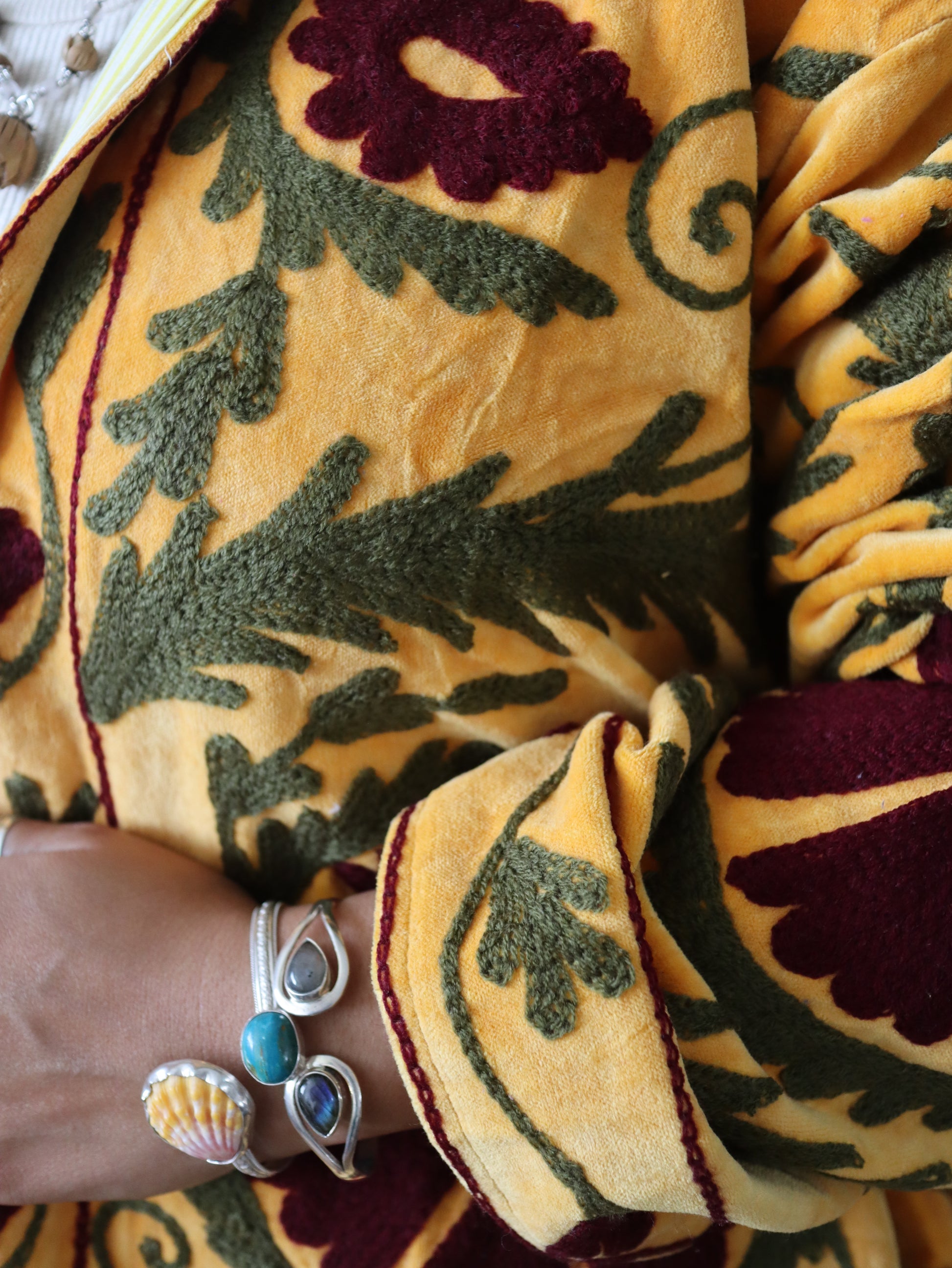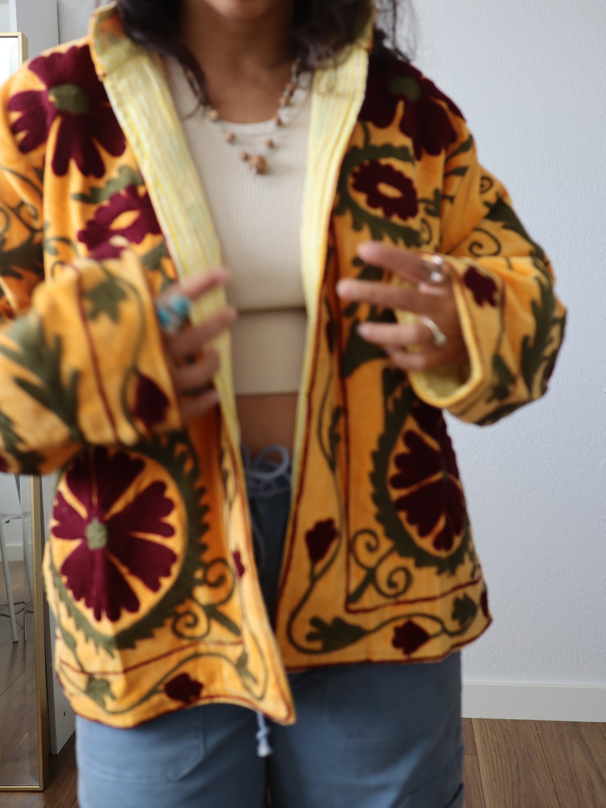 The Goldenglow Cotton Jacket represents timeless versatility meets contemporary design. Fashioned from pure cotton velvet and embroidery, this statement piece drapes in an intentionally oversized silhouette that exudes casual refinement. Flip it inside out to reveal an entirely different multicolor palette—the reversible construction ensures two complete looks from one exceptional garment. The absence of buttons creates an uninterrupted, streamlined aesthetic that speaks to discerning taste. Available in one universal size.