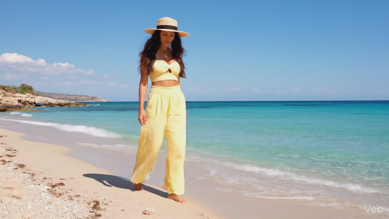 Crafted from 100% butter yellow cotton, these Harbor Cotton Pants offer a refined blend of comfort and style. Featuring an elastic waistband and convenient pockets, they provide ease of wear and practicality. Pair them with the matching Harbor Cotton Top for an effortlessly elegant ensemble.