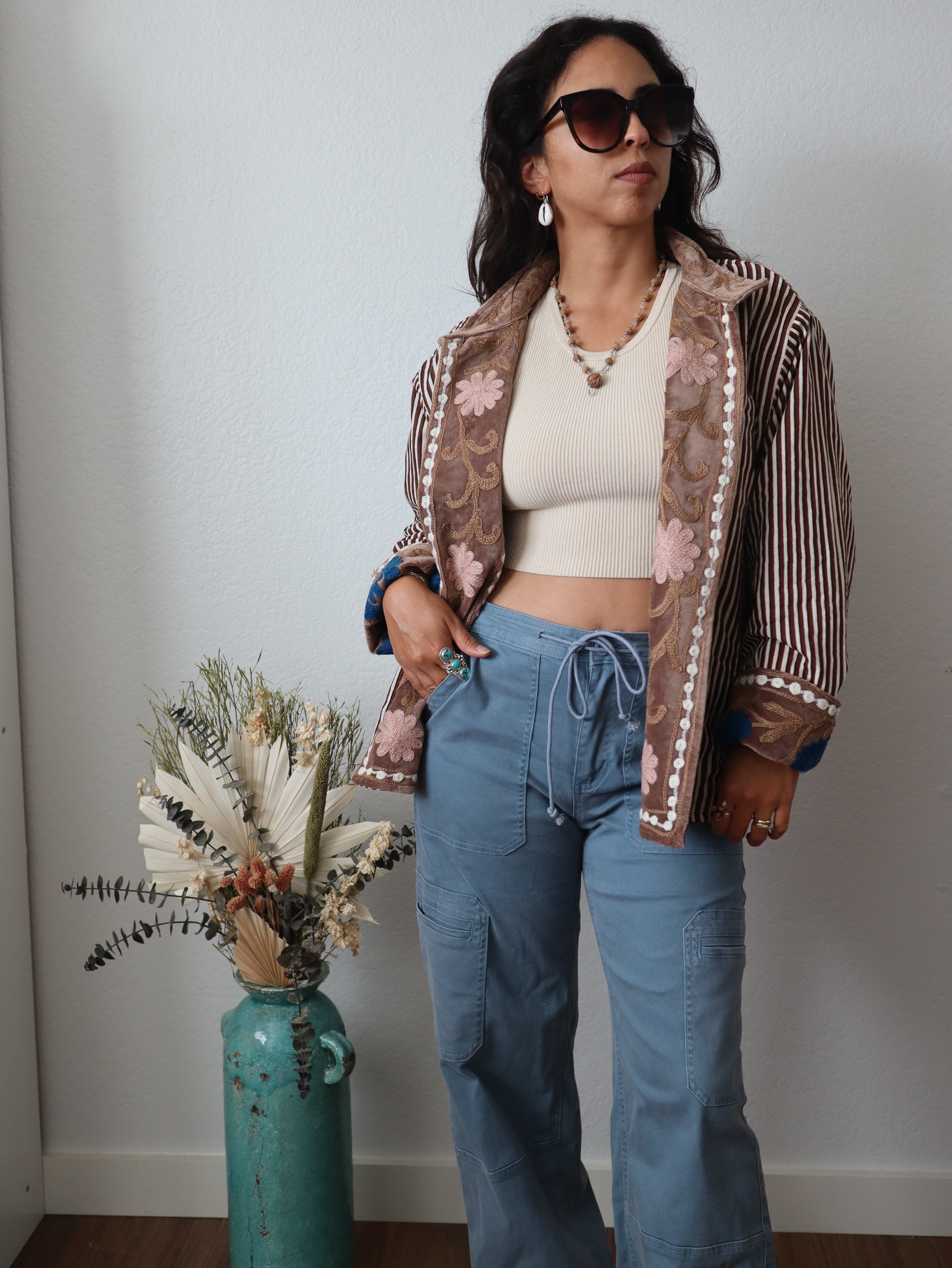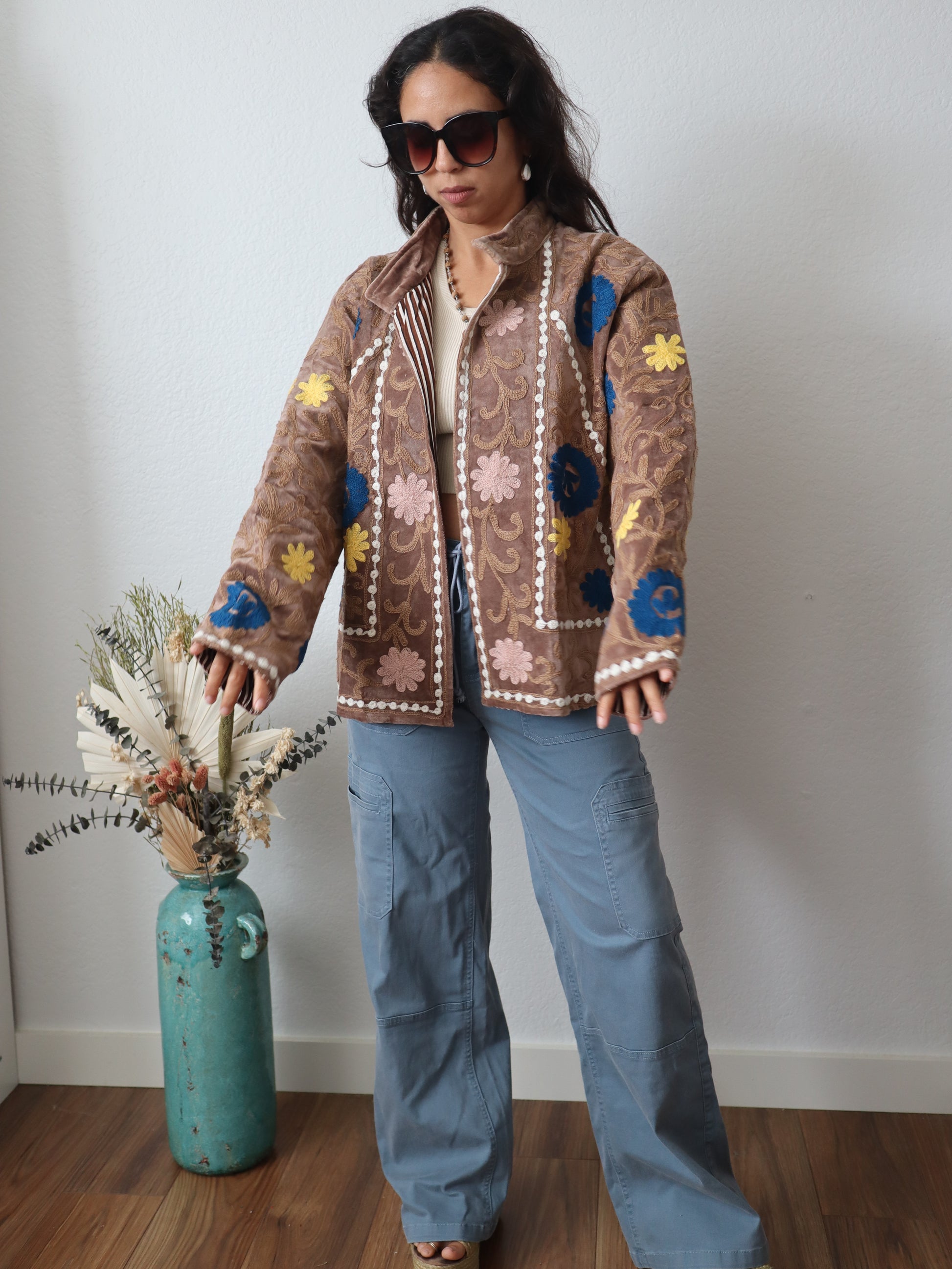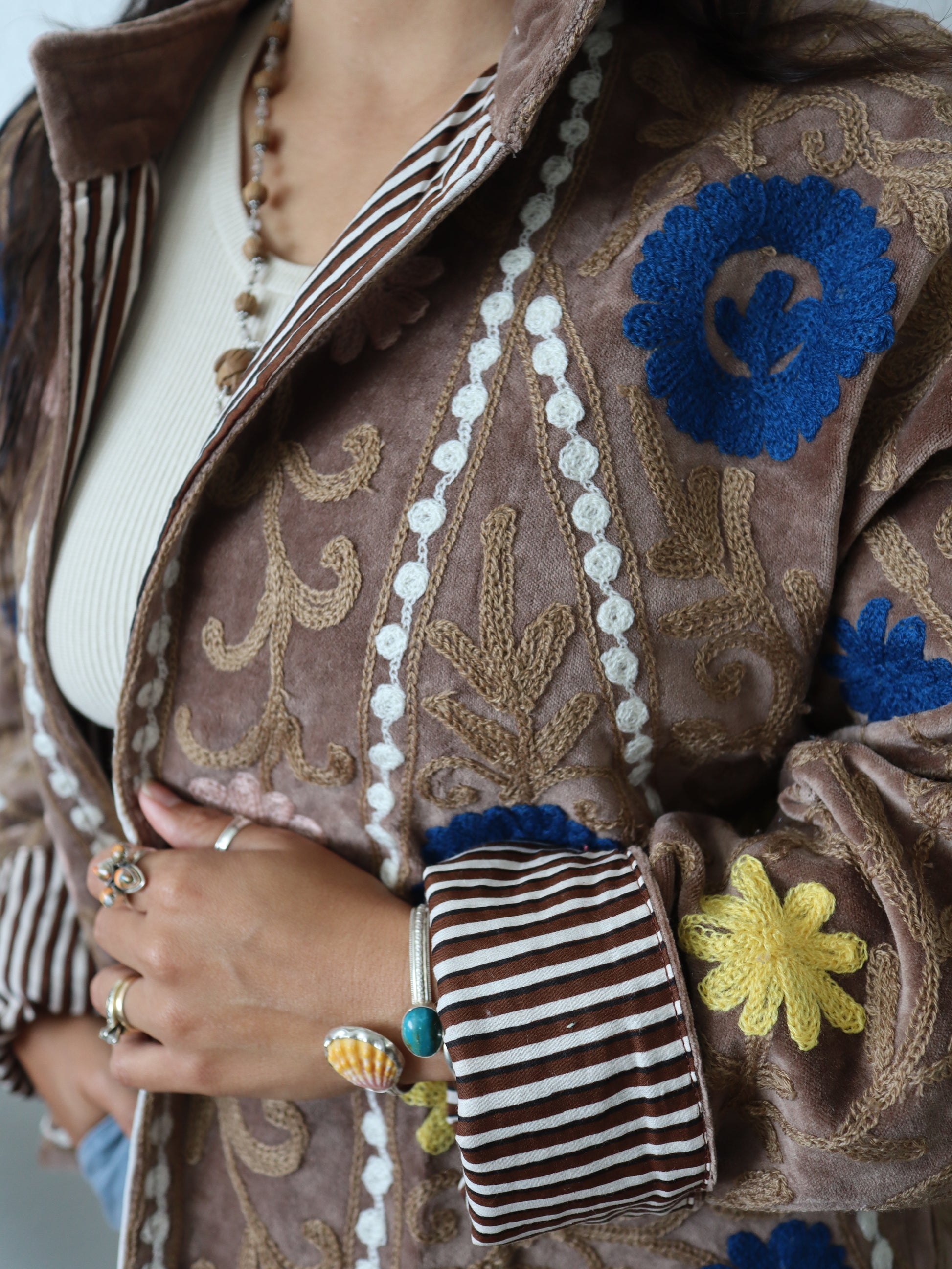 The Kudzu Cotton Jacket represents timeless versatility meets contemporary design. Fashioned from pure cotton velvet and embroidery, this statement piece drapes in an intentionally oversized silhouette that exudes casual refinement. Flip it inside out to reveal an entirely different multicolor palette—the reversible construction ensures two complete looks from one exceptional garment. The absence of buttons creates an uninterrupted, streamlined aesthetic that speaks to discerning taste. Available in one universal size.