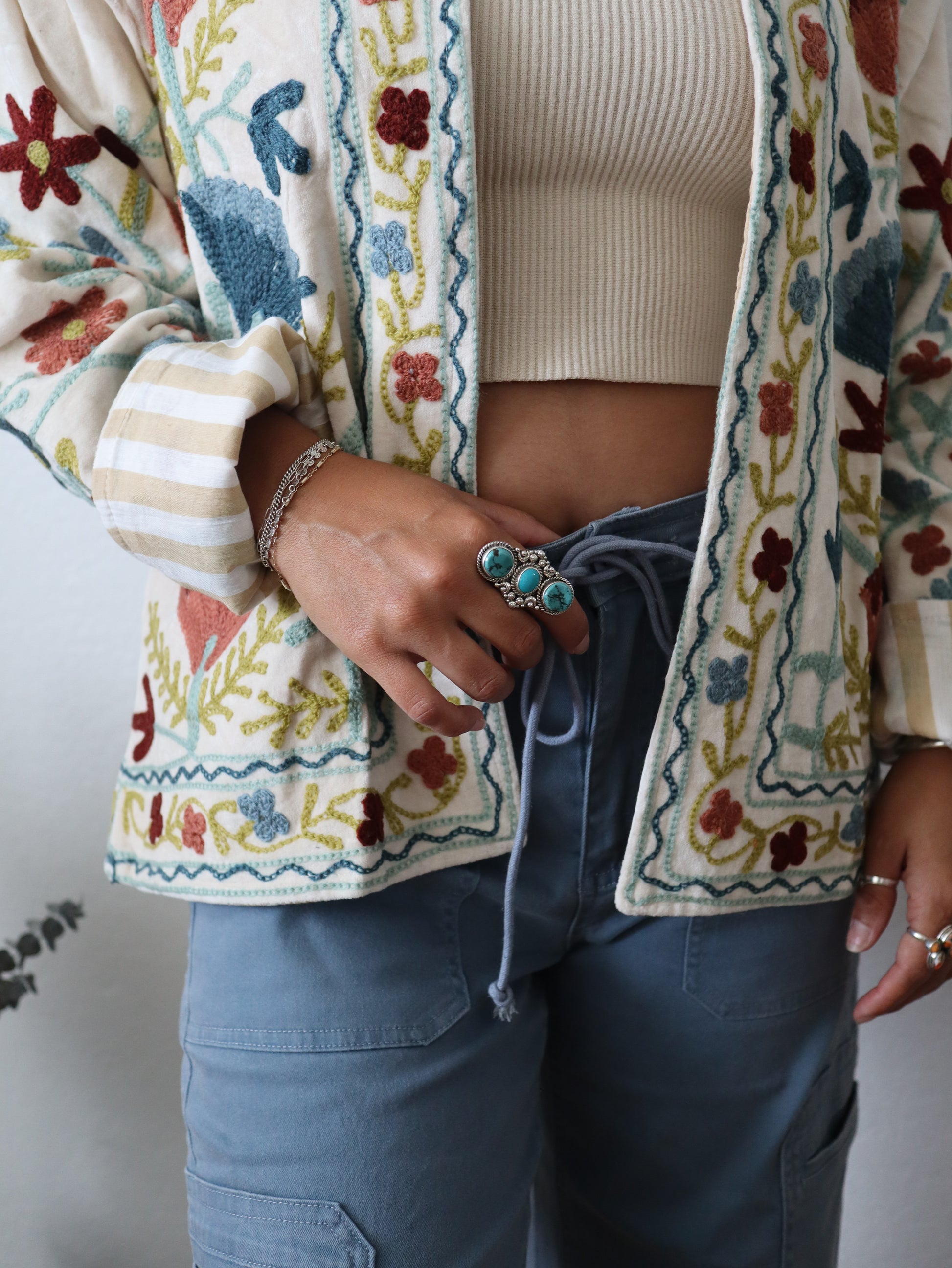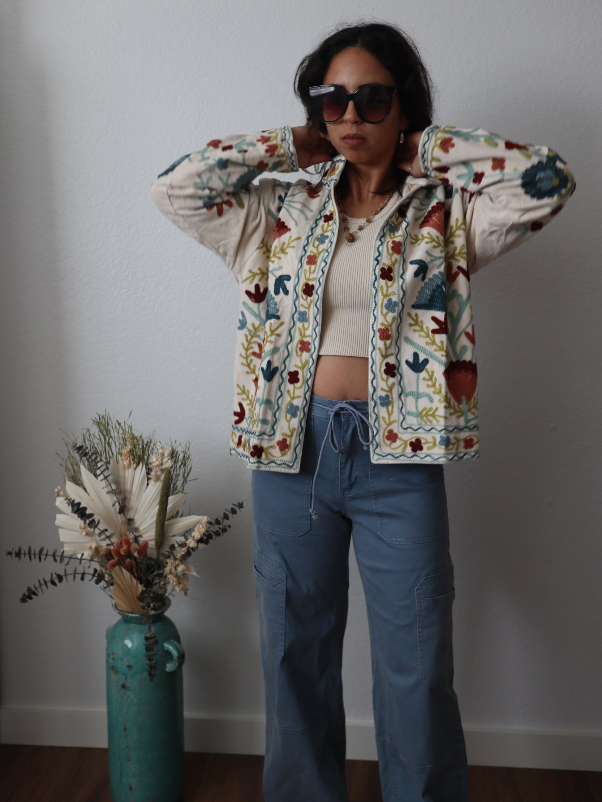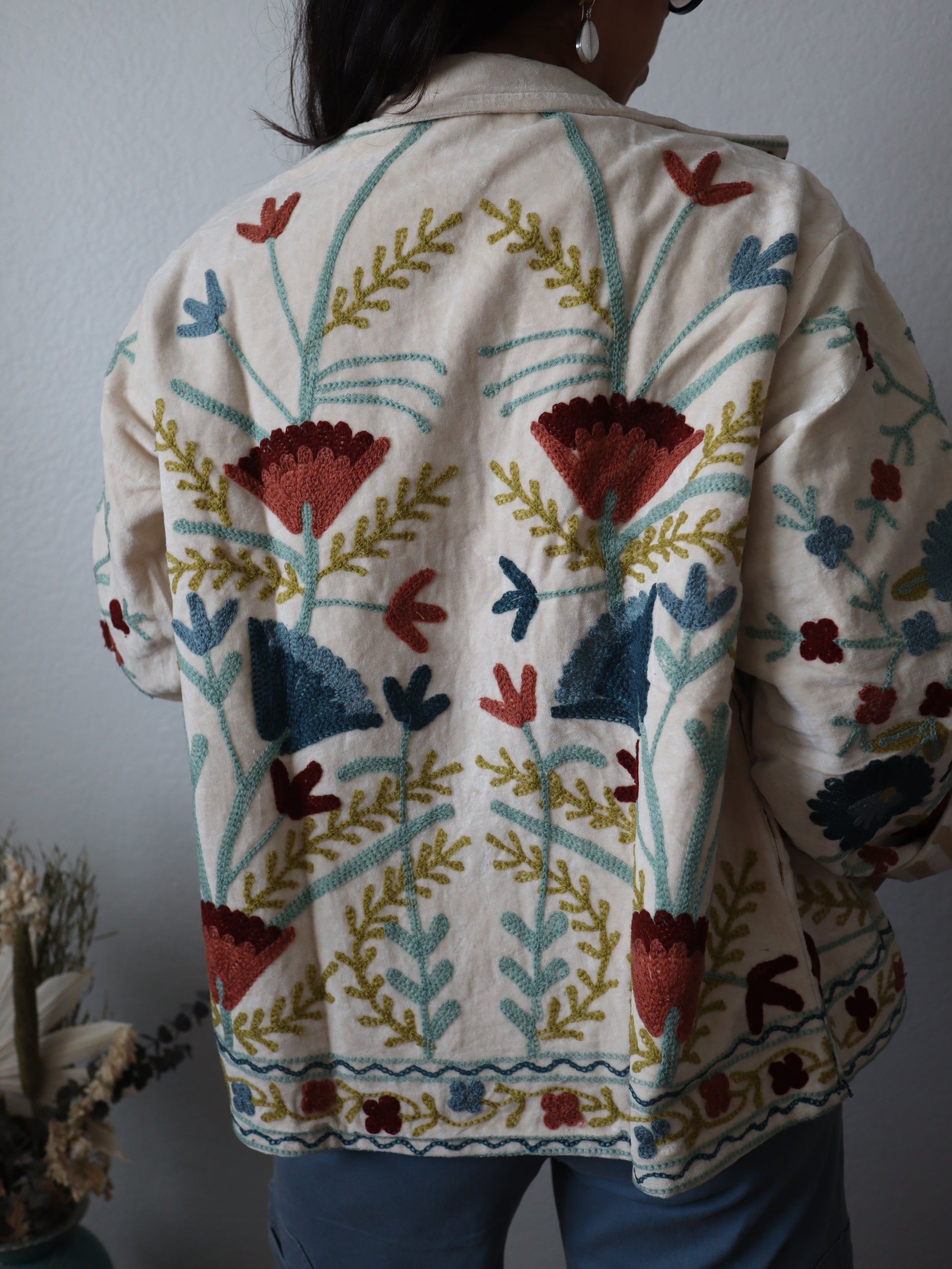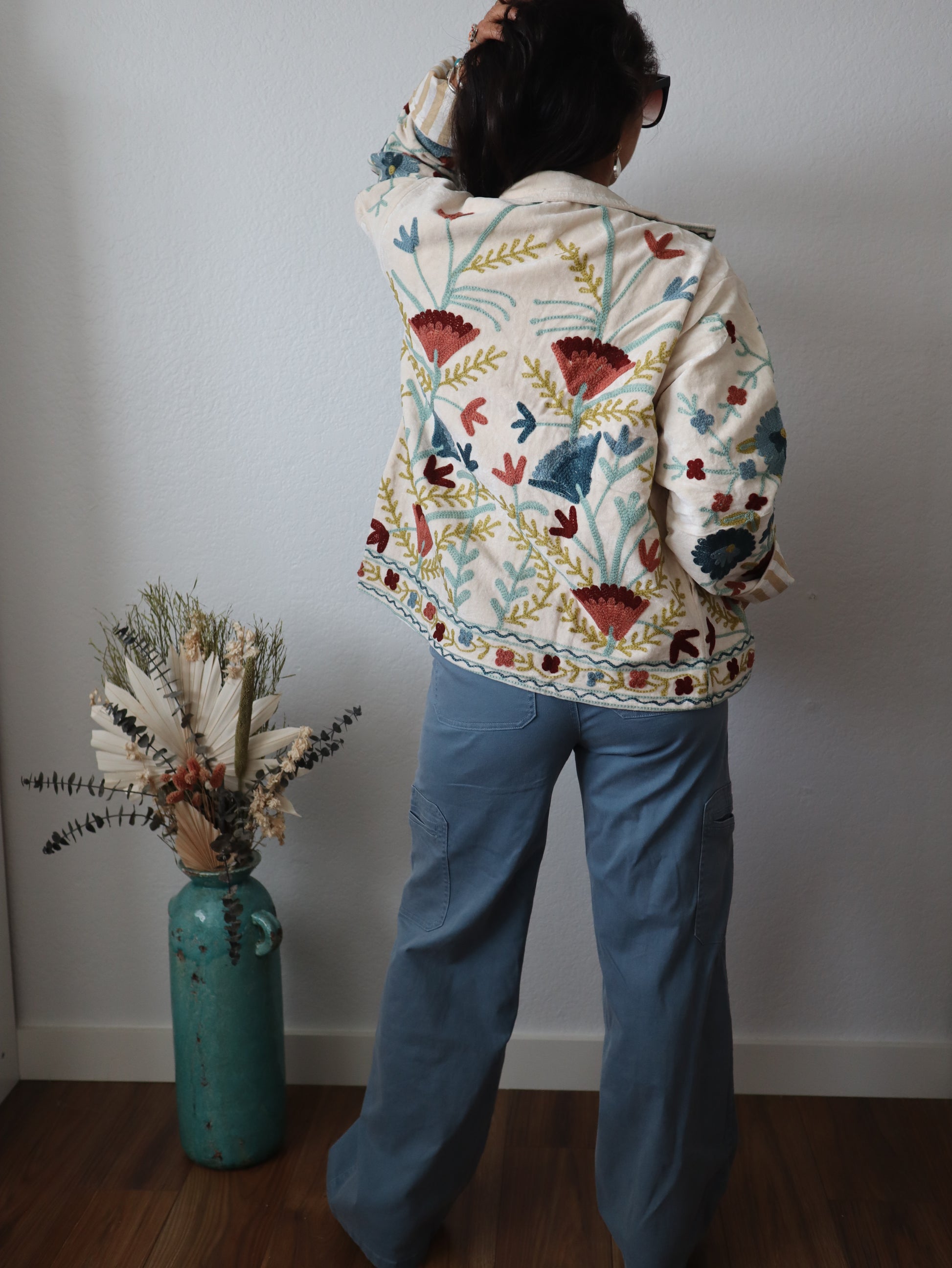 The Moonglow Cotton Jacket represents timeless versatility meets contemporary design. Fashioned from pure cotton velvet and embroidery, this statement piece drapes in an intentionally oversized silhouette that exudes casual refinement. Flip it inside out to reveal an entirely different multicolor palette—the reversible construction ensures two complete looks from one exceptional garment. The absence of buttons creates an uninterrupted, streamlined aesthetic that speaks to discerning taste. Available in one universal size.