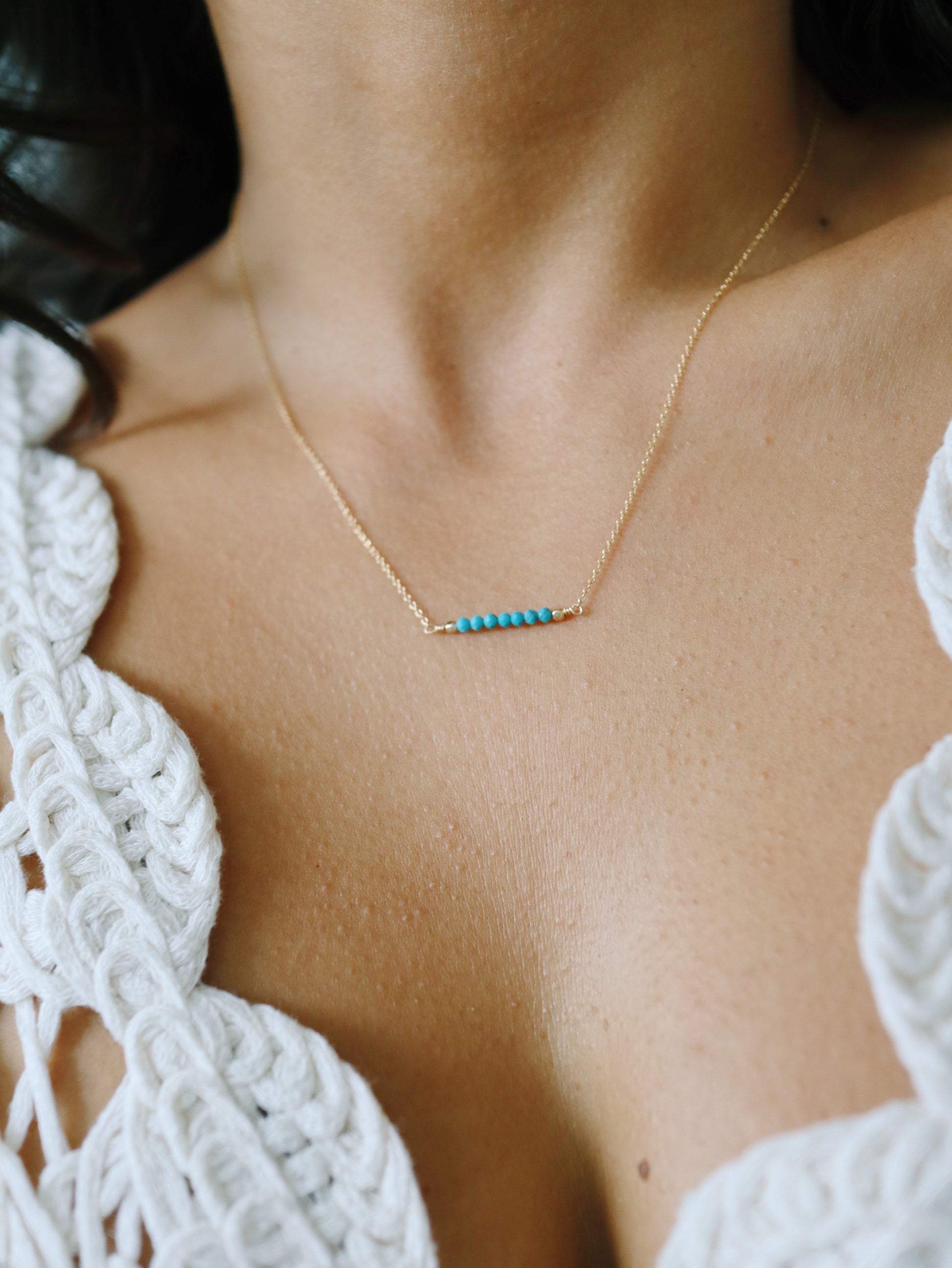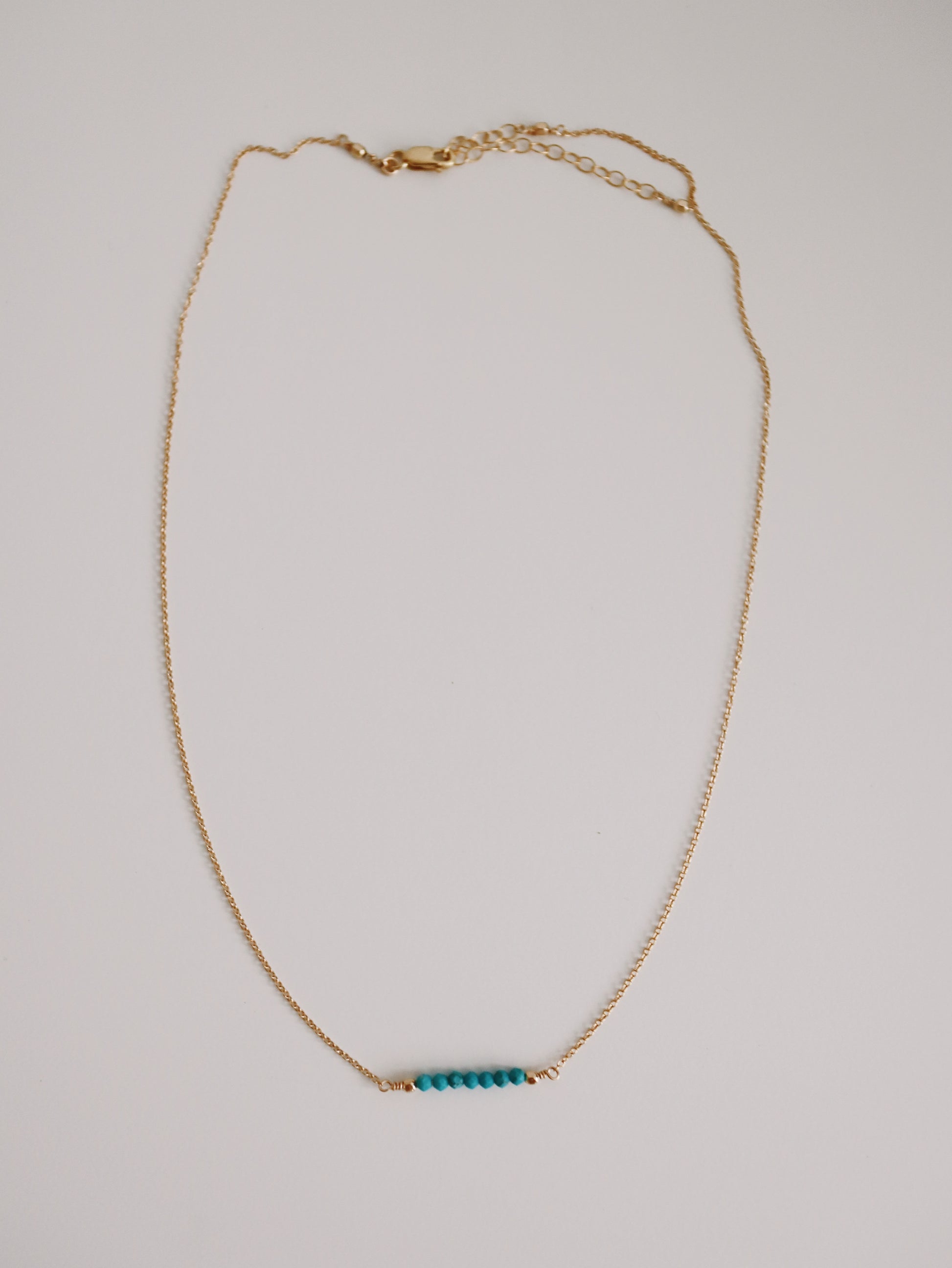 Elevate your elegance with the Oriana Necklace, featuring 14k gold-filled wire-wrapped turquoise gemstones. Its delicate, feminine design makes it an exquisite choice for layering, adding a subtle sophistication to any outfit. This necklace is also waterproof, ensuring lasting beauty and durability for everyday wear.