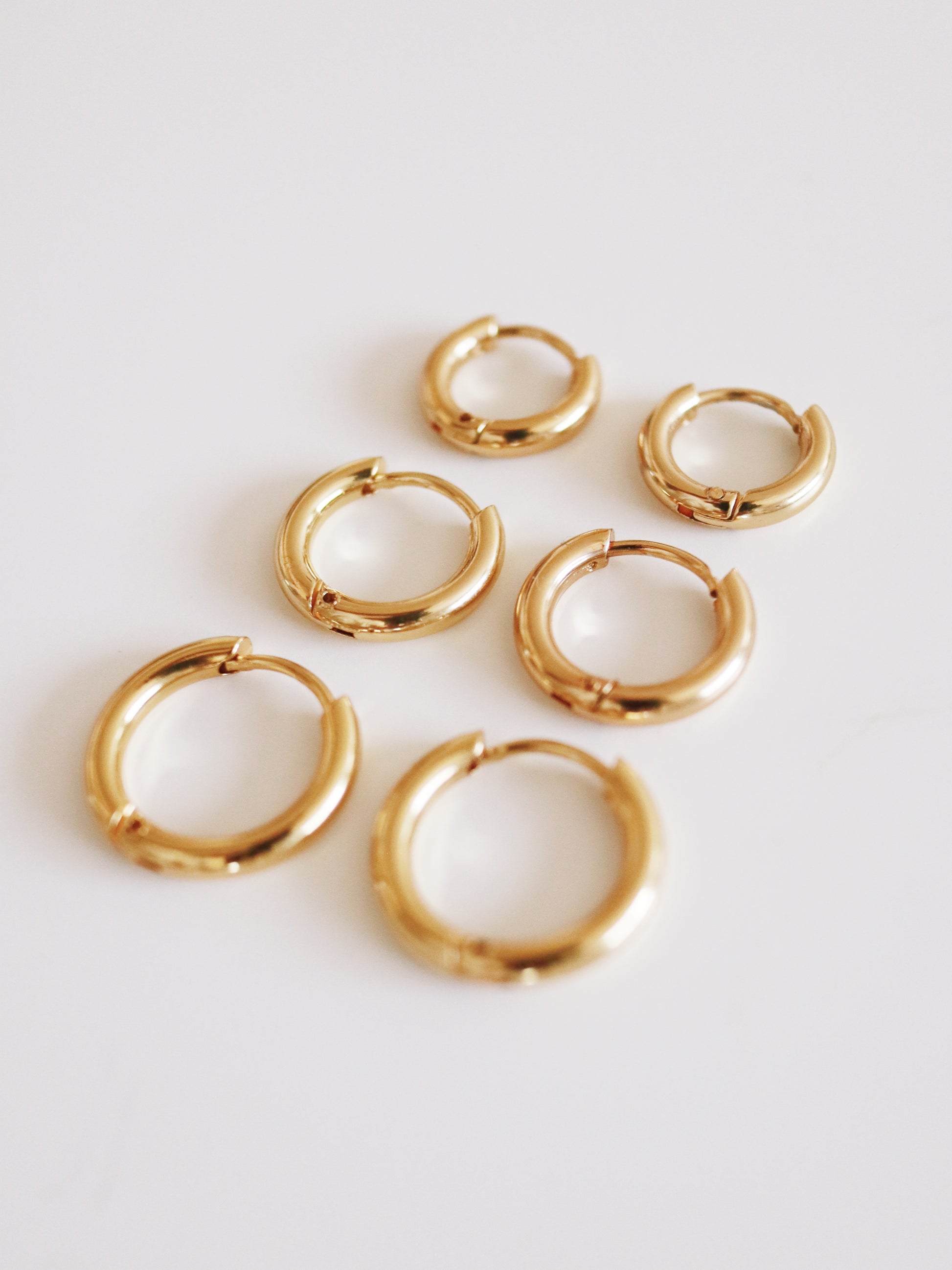 The Parker Gold Hoop Set includes three pairs of dainty hoops in three different sizes, perfect for mixing, matching, or stacking all together. Waterproof and hypoallergenic, these lightweight earrings offer lasting comfort and versatility. Elevate your style effortlessly with this elegant set designed for everyday wear and special occasions alike.
