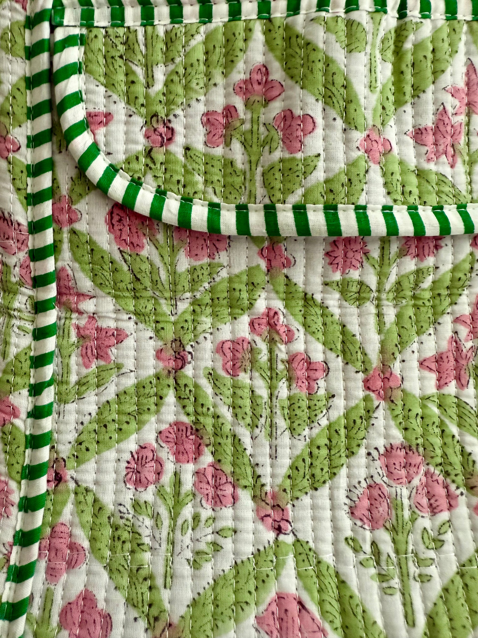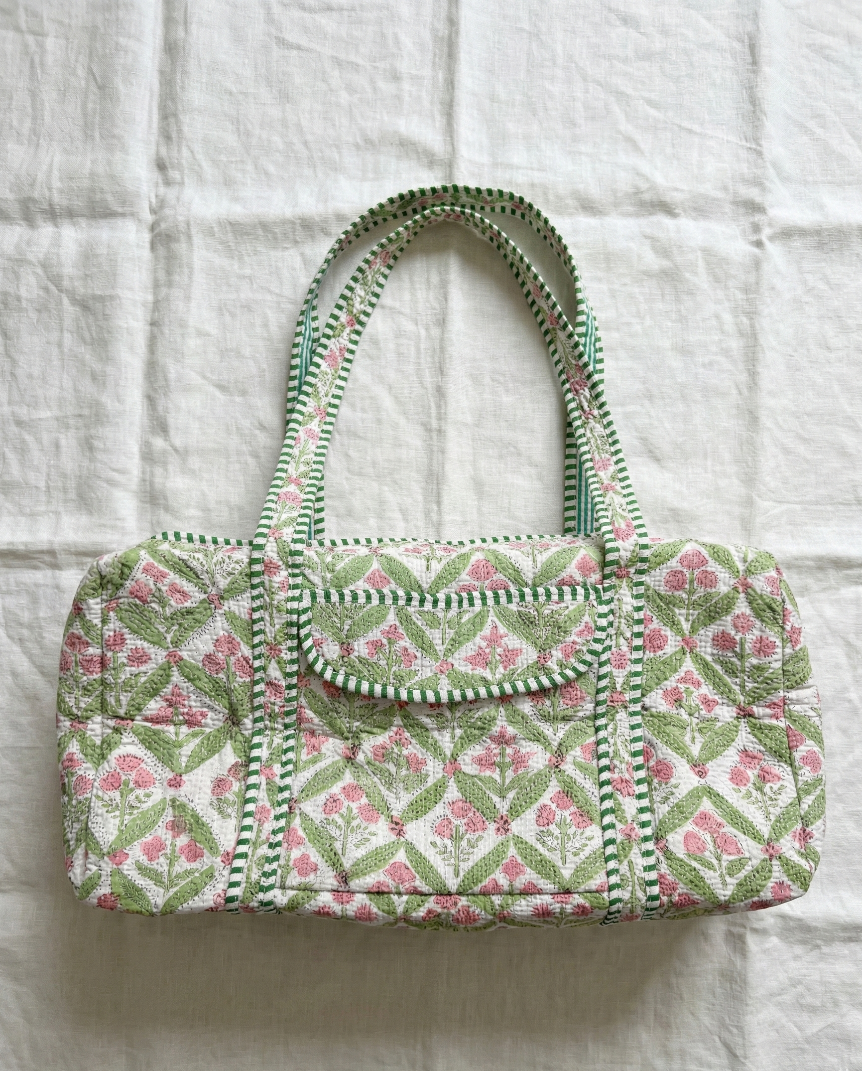 Introducing the Tulsi Duffle Bag - a truly one-of-a-kind accessory! Handmade with 100% cotton in green hues with pink floral accents, it boasts a unique blockprint design that sets you apart from the crowd. Plus, its compact size makes it perfect for packing it or using it as your personal or carry-on luggage on your next vacation, as a diaper bag or beach bag. Don't miss out on this playful, travel-ready bag.