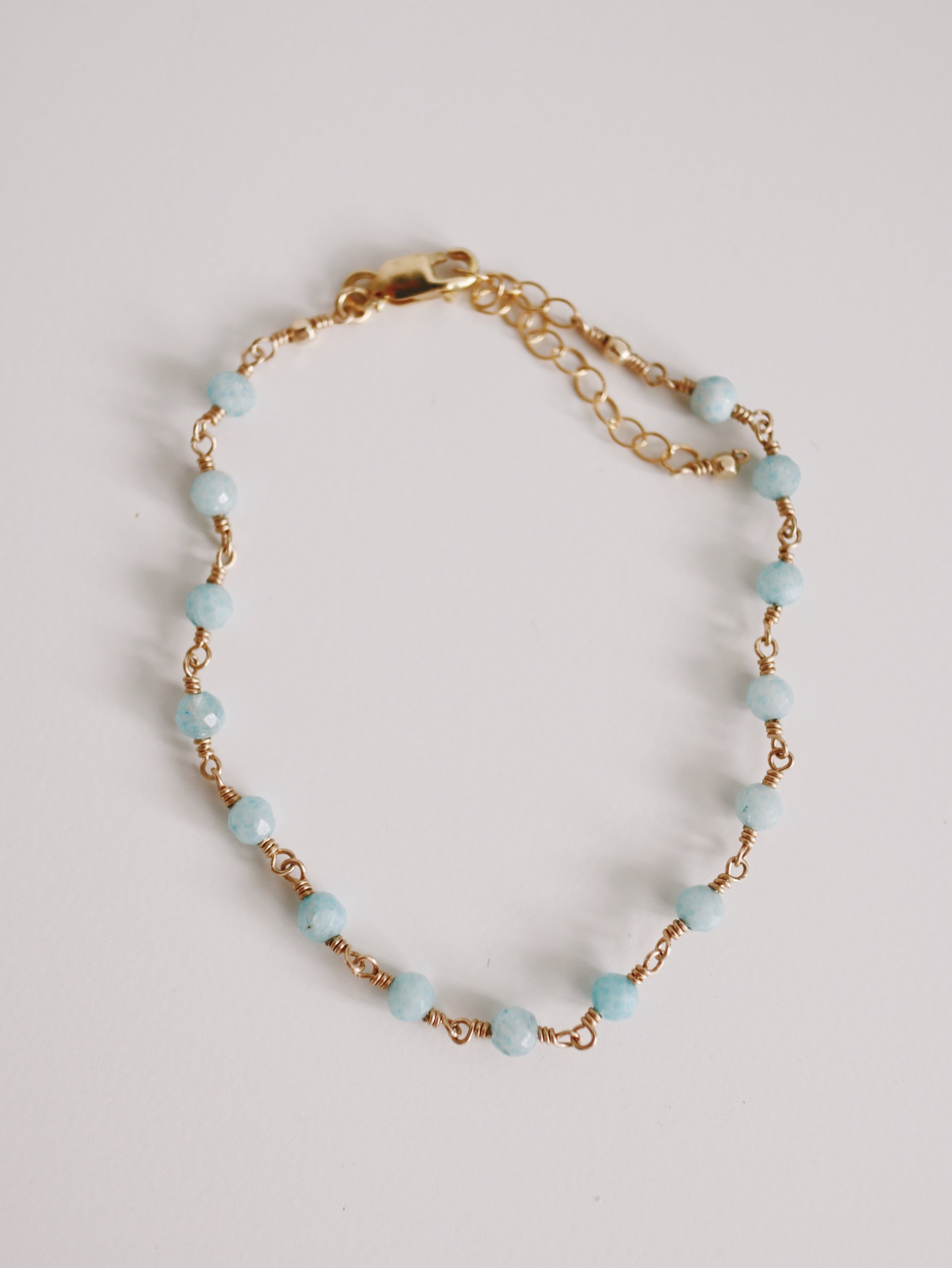 The Vivienne Bracelet blends delicate 14k gold-filled craftsmanship with elegant aquamarine gemstones, creating a refined and feminine accessory. Its dainty design is perfect for stacking, adding graceful layers to your wrist. Waterproof and enduring, this bracelet complements any look with effortless sophistication.
